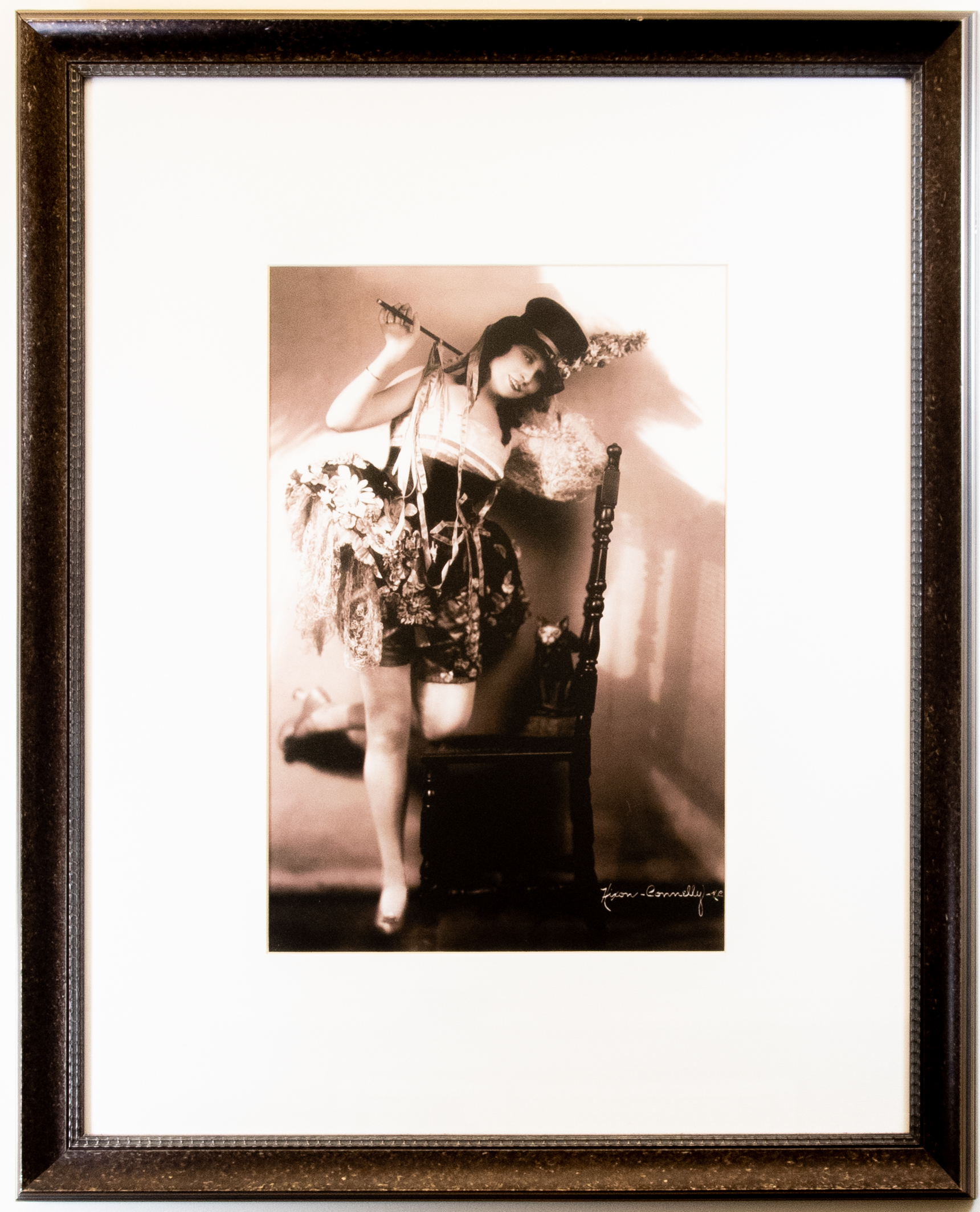 Perhaps it is the hat playful perched on her head and baton resting on her shoulder that brings to mind images of a mischievous ringmistress preparing to interact with us, her audience. Rhea stands resting her left elbow and knee on a hardwood chair. In her hands, she holds a beribboned baton behind her neck. Rhea looks striking in striped underpinnings secured by shoulder straps under a pannier corset embellished with flowers and lace. She completes the costume with silk embroidered shorts, satin heels. a single bangle bracelet and a gold ring. Another element of whimsy is added by a diminutive cat sharing the chair with Rhea.