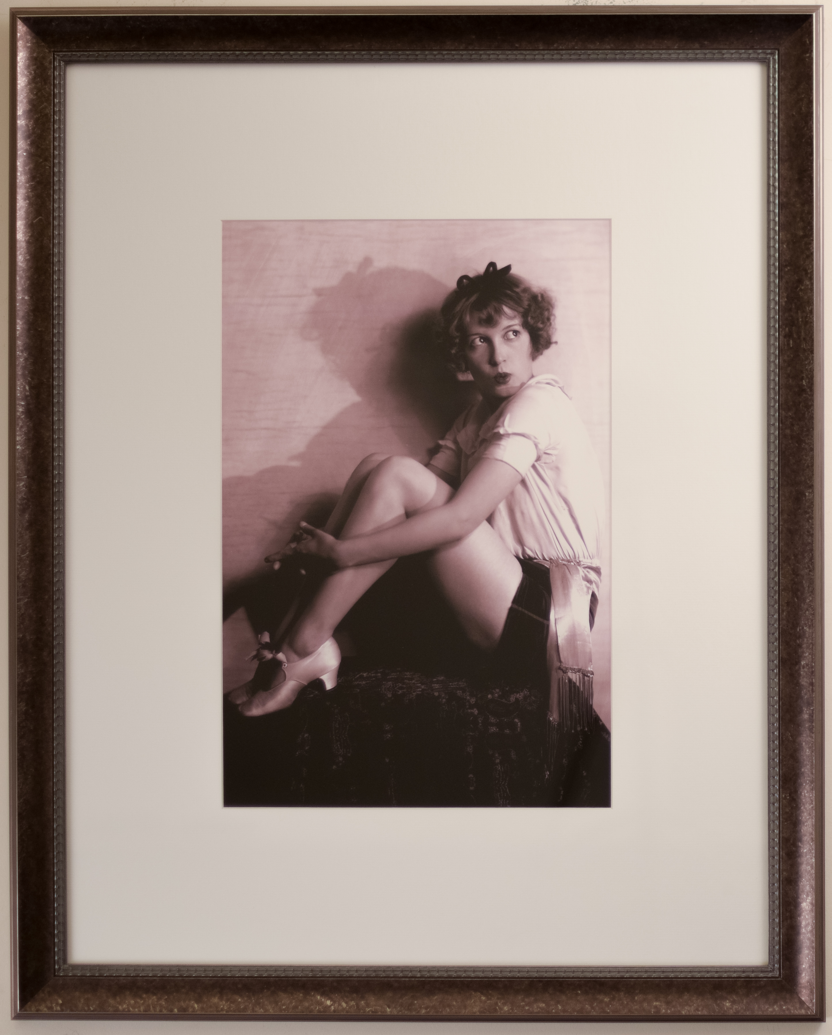Nan Halperin appeared on the vaudeville stage at the age of fifteen performing impersonations and comedic musical numbers. Over the course of her career, she became known as America’s “Famous Satirist” for her impersonations of the life stages of ordinary American women as well as the "Wonder Girl" because of how fast she was able to change costumes while doing these impersonations. In this full-length photograph from 1920, she is depicted in a seated position just to the right of center with her knees pulled up close to her chest and hands clasped in front of her shins. While her face is directed straight at the viewer, she gazes coyly toward the upper corner of the space with puckered lips. Her bobbed curly hair is adorned with bow. She is dressed in a short-sleeved satin blouse, velvet shorts, and satin heeled shoes. She sits upon an ornately decorated tapestry. The shadow in the background reflects her image perfectly.