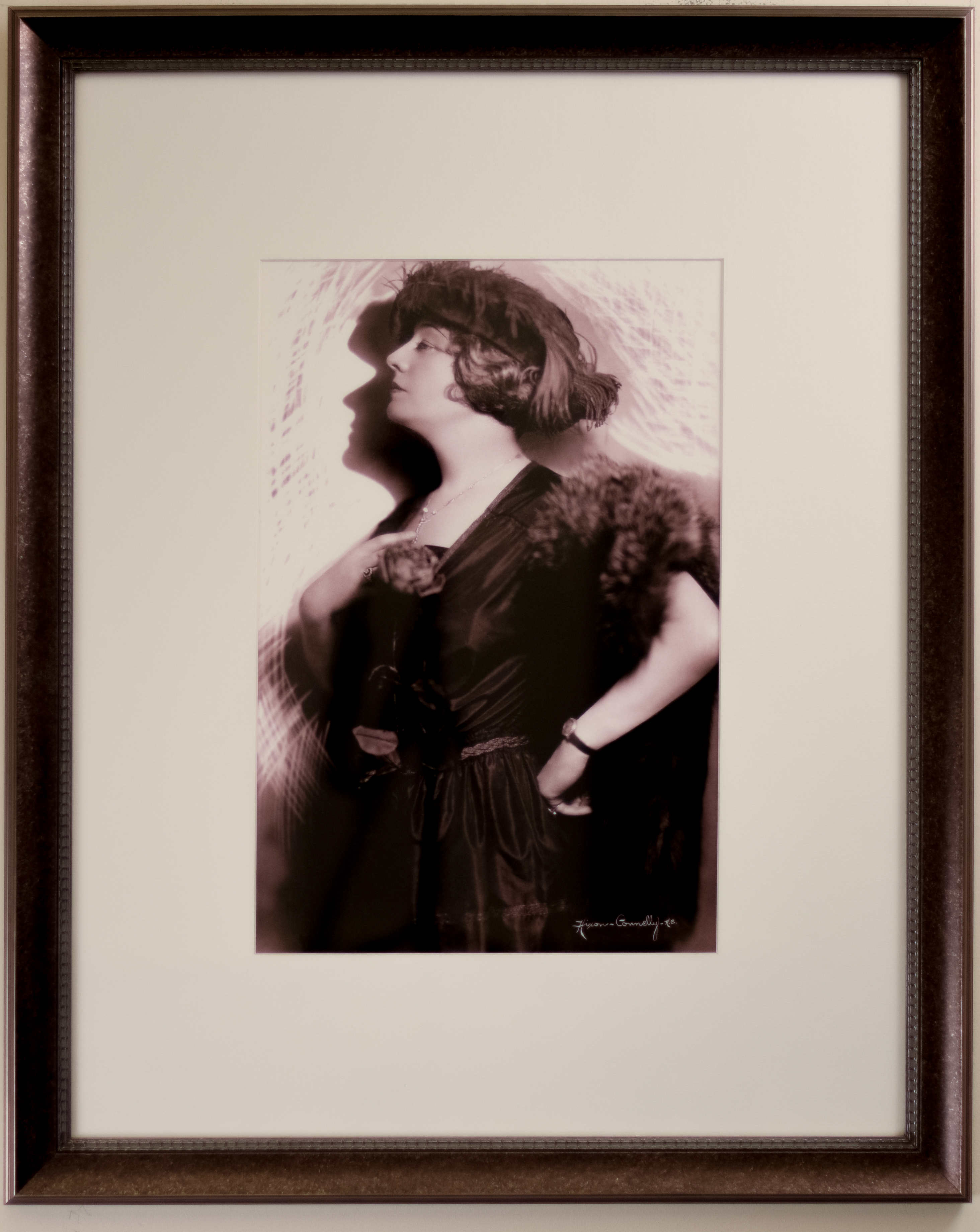 Nora Bayes was a vaudevillian comedic performer. At the age of 18, Bayes entered Vaudeville. She was an effortless singer and could put over any song. By 1898, vaudeville was becoming accepted as a form of family entertainment. Bayes was a beauty with a husky voice and sold the songs with a vivacious manner. Her effortless delivery won over every audience. Bayes comedic and acting abilities made her perfect for the times. She was a successful songwriter with credits for such big hits as "Shine On Harvest Moon". Bayes introduced and recorded many other popular songs like "Over There", "Japanese Sandman", and "How Ya Gonna Keep Em Down On The Farm". Warner Brothers produced a 1944 fictionalized movie "Shine On Harvest Moon" about her life which included many of her songs. In this portrait, Bayes is centered and posed in a side view gazing right. She is formerly attired, wearing a dark dress with a pleated belt. Her outfit is accentuated by the fur stole draped over her left arm and plumed hat. Bayes accessories include a simple metal necklace, two beringed fingers and a wrist watch on her left arm. A single long stemmed rose accentuates her attire, as the stem appears to be tucked into her belt, and the bloom is nestled against her chest.