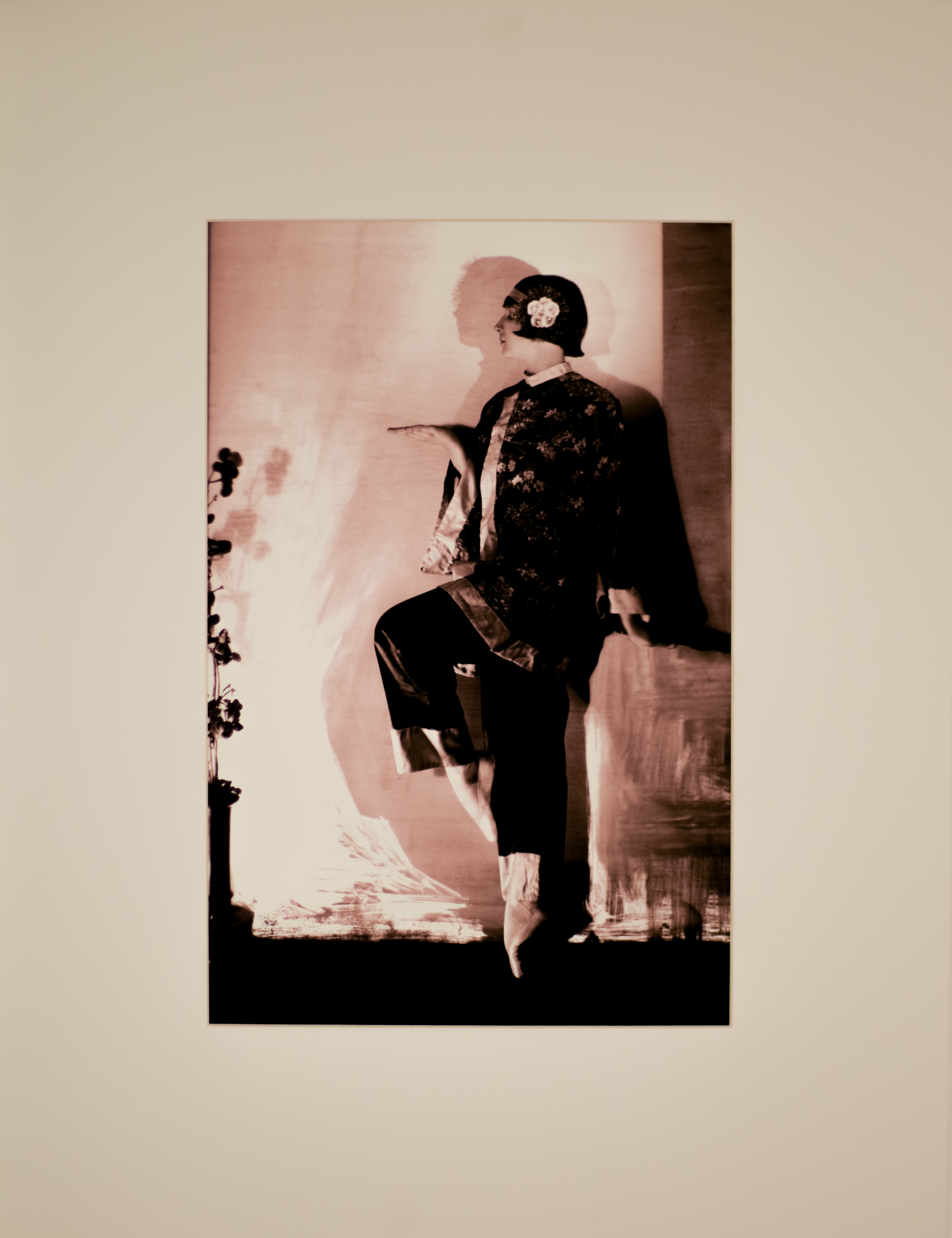 Sammy Baird was a local KC dance instructor and vaudeville performer. This picture captures a profile view of Baird in a dancer's pose, effortlessly balanced on a single pointed toe with the other leg bent and lifted. She repeats the motion with her arms, holding a leveled hand to her front and back to conclude her overall balance. She looks down at a point before her with a calm, concentrated expression, although a bright swatch of light erupts in that space that resembles a burning fire. It simulates a reflection of light off of the silk material of her oriental attire that works to convey the elegance of her pose. She pairs her outfit with the short haircut and flashy headband characteristic of the flapper style. Hixon manipulation of the background creates a dynamism that contrasts Baird's composure.