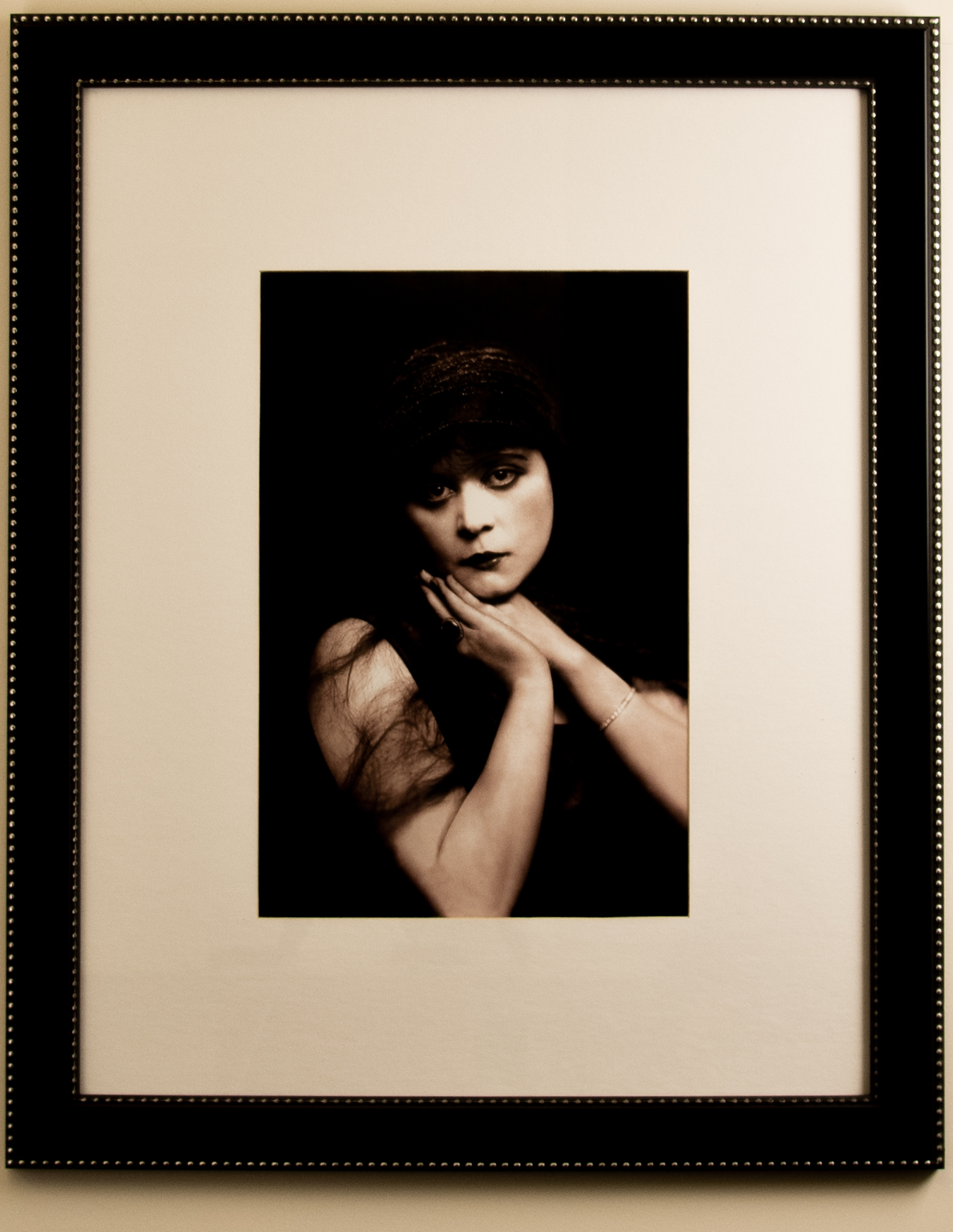 Sepia toned photograph of Theda Bara. Theda Bara was an American actress in both silent film and the stage. Bara was cinema's original vamp, the dark, heartless seductress who lured men to their destruction. It was a persona that she and her studio also perpeturated off-screen. The daughter of immigrant Jews, Bara was born Theodosia Goodman in Cincinnati, Ohio. It was widely thought that she took advantage of her stage name as an anagram for "Arab death." After becoming a star in her first major film, 1915's "A Fool There Was", she appeared in more than three dozen silent films over the next four years. This photograph captures Bara in a posed position, clasping both hands while simultaneously gently supporting her chin. Bara tilts her head slightly to the left. The original photograph was created in 1921, by famed photographer Orval Hixon. Hixon was a long-time resident in Kansas City, Missouri from 1903 through 1930 before moving to Lawrence, Kansas.