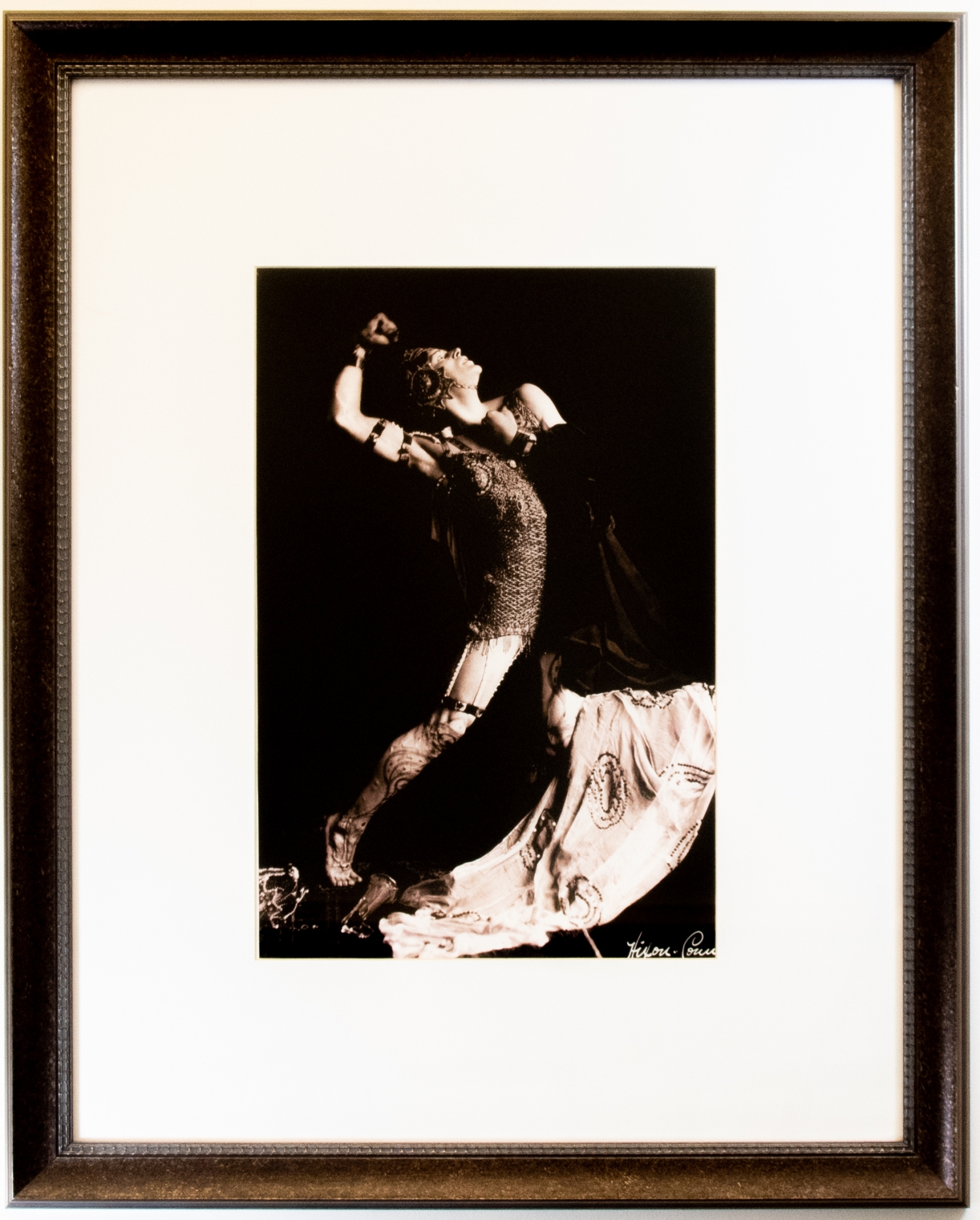 Dancer and choreographer Theodore Kosloff (1882-1956) trained from a young age at the Imperial School of Dance in Moscow. His fame came when he began dancing in England and France before moving on to the United States. There, he started a nationally renowned school of dance in Los Angeles and performed in several Cecil B. DeMille films. In this portrait, Kosloff is posed as a virile warrior still reveling in either the spoils of a victorious campaign or the tragic woes of defeat. With his decidedly dramatic pose, he could have come straight off of a hellenistic period vase. He wears a highly ornamented chainmail shirt and multiple leather armbands. Both legs have been painted with evocative designs and sport garters and legends. He stands with his feet wide apart, his back arched and his right arm flexed and hand clenched above his head which is tilted back. In clenching his left fist to his chest, he holds a swath of velvet that lends to the drama captured in the image. He stands in the midst of multiple souvineers all evoking priceless plundered objects taken as trophies of war: a sequin-embellished textile, a metal tankard, and several crowns.