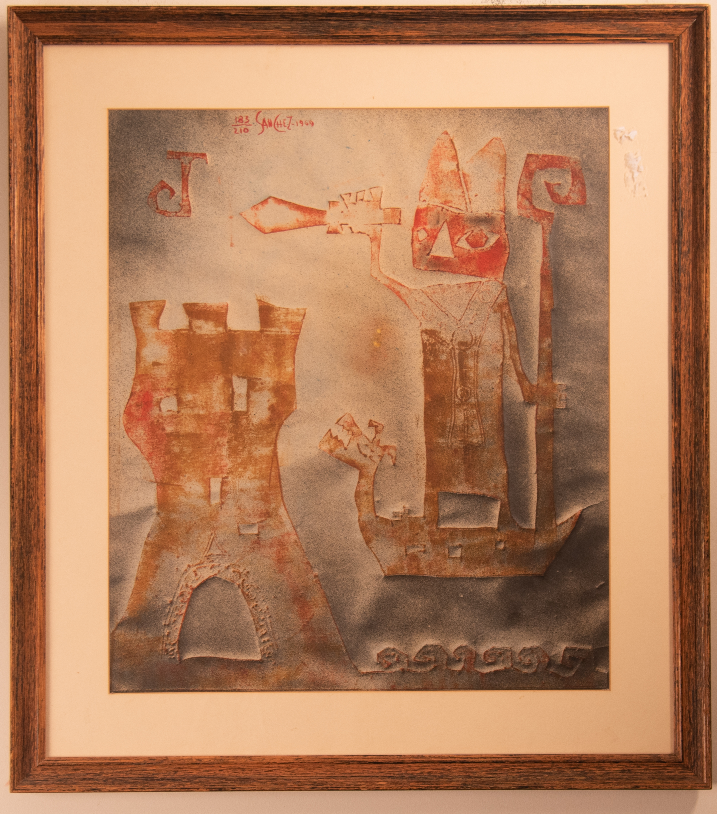 Enrique Sanchez, born 1938, is a well known Latin American artist. Sanchez who is noted for his Postwar and Contemporary paintings is additionally recognized for his illustrations in childrens' books. This work depicts the artist's version of a historical narrative, possibly of James I conquering Ibiza in 1238. The most predominant figure is that of an apparent royal person, bearing a sword and holding a staff. The figure appears to be wearing a crown as he stands astride a dragon shaped boat. The scene also contains a roughly detailed castle. This structure appears to be situated on a coast, also apparent are a sequence of six waves that roll toward the castle. A stylized letter "J" is positioned in the upper left corner of the composition. The following dedication is listed at the upper area of the work "183/210", "SANCHEZ" and "-1969". The work is colored with hues of blue and red.