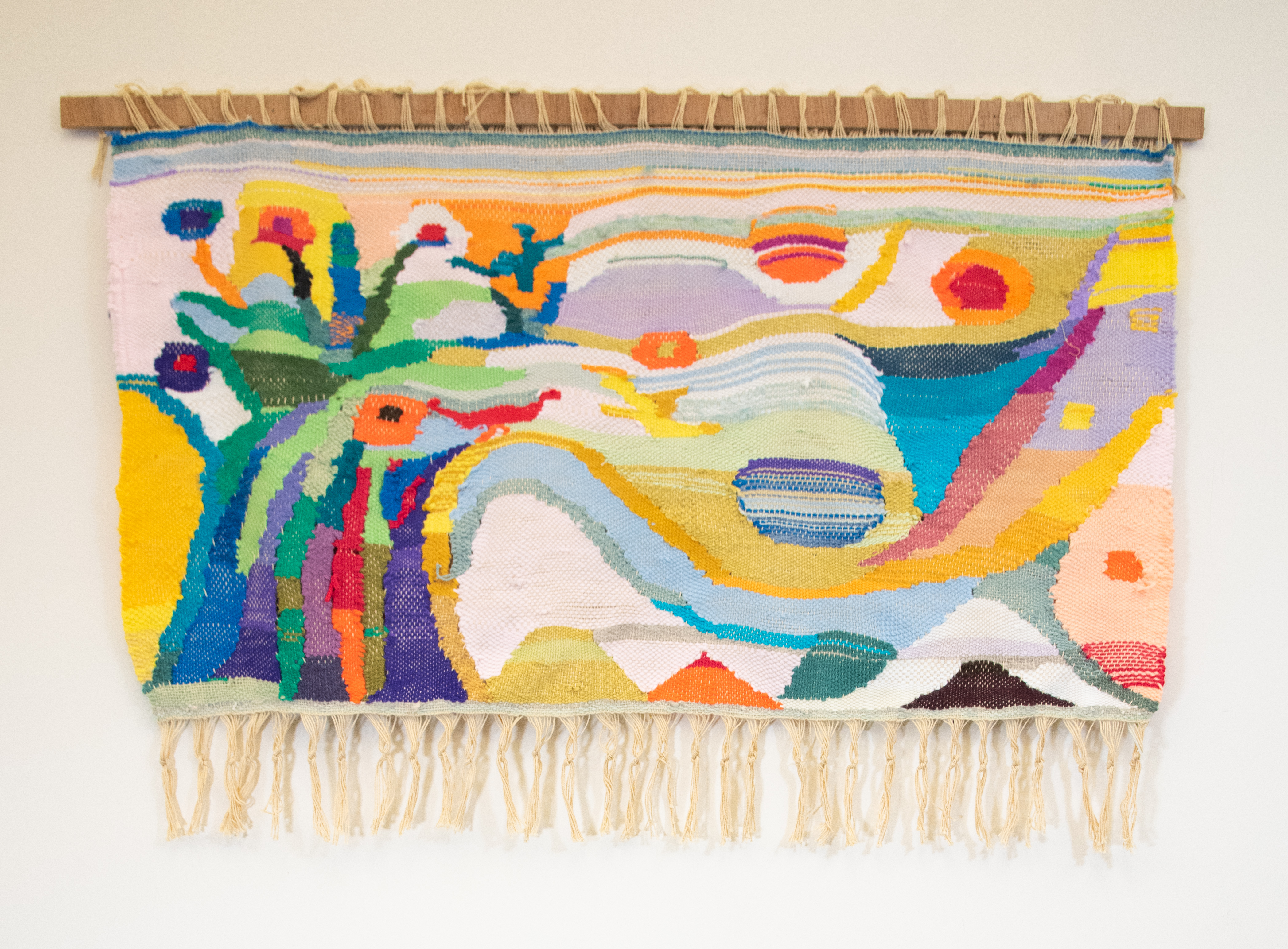 Gabriella Polony Mountain's work includes four major themes. The first three themes are clearly recognizable as the Cosmos, Nature, and Figural works with the fourth theme encompassing history, philosophy, and culture. In her life as an artist, Polony Mountain worked with many different medium including mosaics, weavings, sculpture, stained glass, and repousse. Weaving is a technique used to make textiles by interlacing thread. This technique can be accomplished with the use of an instrument called a loom, or by hand in various methods such as knitting, crocheting, felting, braiding, or plaiting. Polony-Mountain used a combination of loom and hand weaving techniques. And like her weaving techniques, Polony-Mountain used a combination of acrylic, cotton, and wool yarns to create her vibrant textiles.