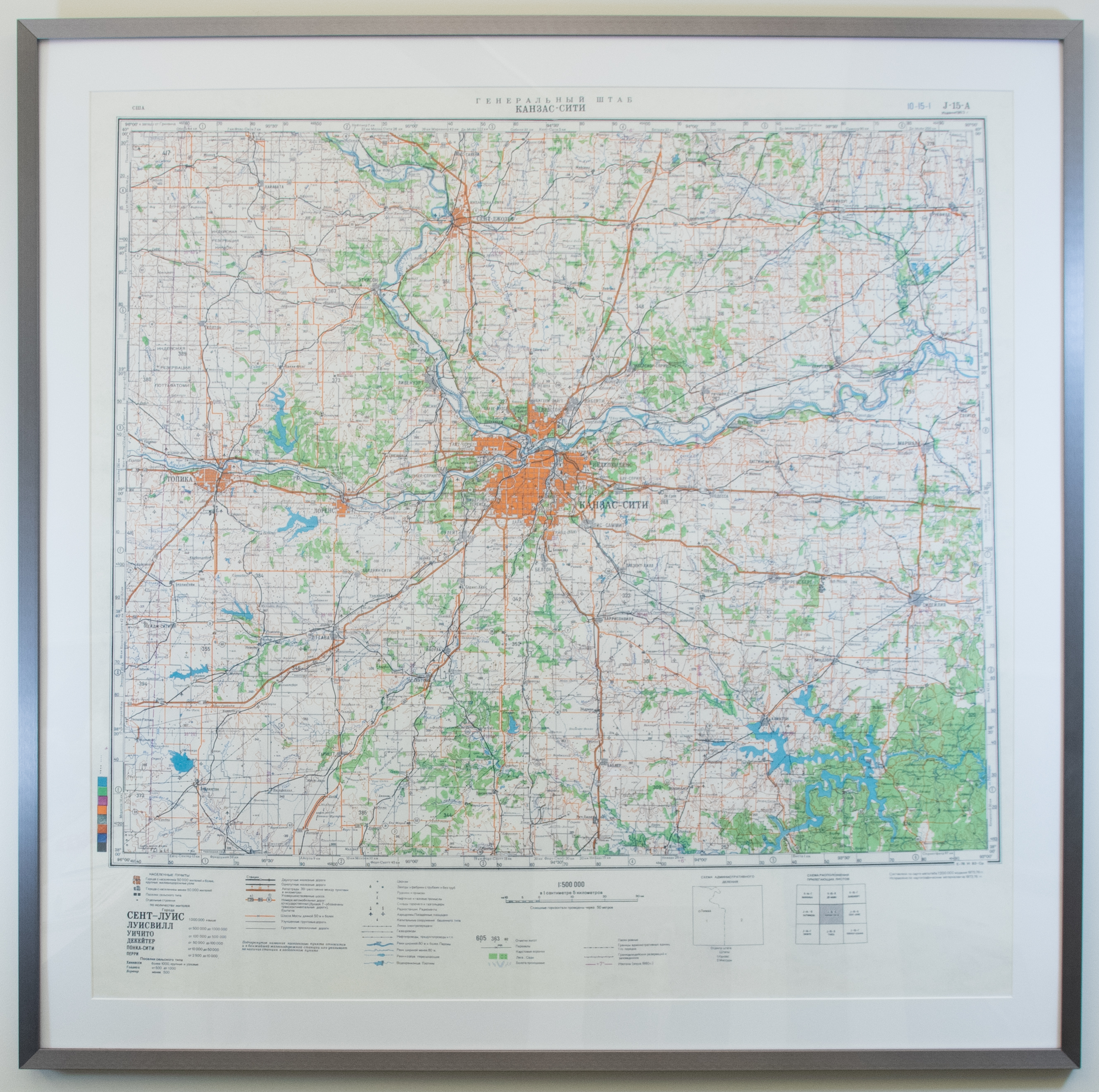 This enlarged map of Kansas City with a scale of 1:500,000 (1 centimeter to 5 kilometers) including a regional breadth of about 150 miles in any direction. The map is in Russian and focuses on infrastructural features in the region including road and railways, oil, gas, and airfields, gas and power lines, and dams and reservoirs amongst other things. The map's title translates roughly to the General Area of Kansas City and had 10-15-I J-15-A Edition 1983 stamped in the upper right-hand corner. A number of legends span the bottom edge of the map including one for cities and their populations, the infrastructural features mentioned above, land features, state and Indian Reservation boundaries, as well as this particular map's placement in relation to other versions of surrounding regions.