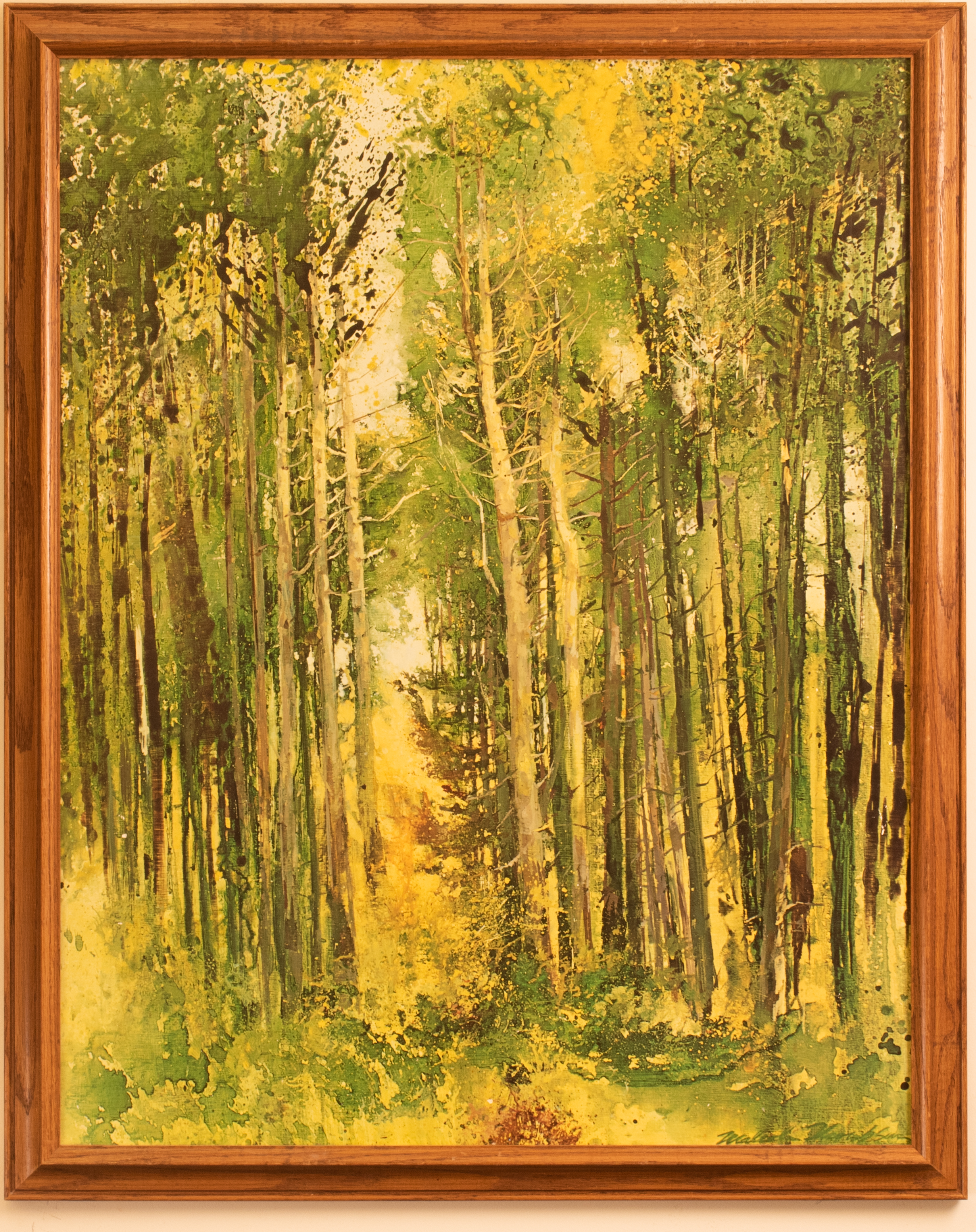 The essence of "sanctuary" pervades the atmosphere of this scene and proves an appropriate title for the work. Splatters of green and yellow paint around the edges materialize into the slender trunks of birch trees at the center. The resulting forest is dense but breaks to provide a passageway to a golden opening on the other side. An interplay of commotion and serenity recreate the energy and yet simultaneous stillness in a forest such as this one. The viewer feels the presence of sanctity in the midst of the foliage but realizes its potential as well in the golden glow ahead. At a glance, the work shifts back and forth from an artist's palette to a portrait of nature causing the viewer to engage their perception and consider the presence of sanctuary.