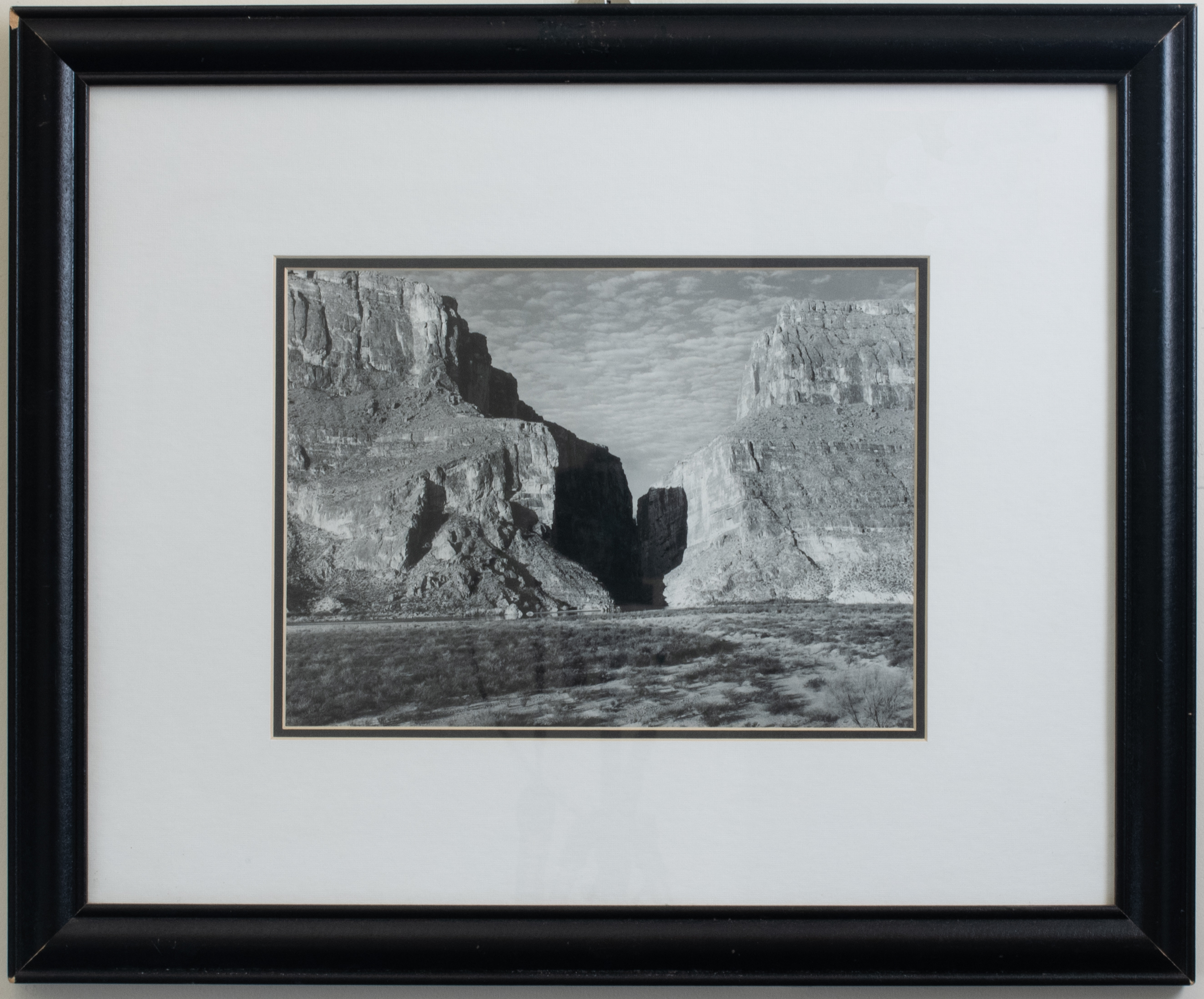 Ansel Adams was a pivotal 20th-century photographer and environmentalist of the American landscape. After extensive travel through the West, Adams developed an eye for the grandeur and beauty of the world around him and used photography as his means for communicating it. His website remembers him as such: "Adams was an unremitting activist for the cause of wilderness and the environment. Over the years he attended innumerable meetings and wrote thousands of letters in support of his conservation philosophy to newspaper editors, Sierra Club and Wilderness Society colleagues, government bureaucrats, and politicians. However, his great influence came from his photography. His images became the symbols, the veritable icons, of wild America" (-www.anseladams.com). In this photograph, Adams captures the silent relationship between two massive plateaus. They form a canyon that narrows into the shadows created by one towering formation on the other. The sparse clouds in the expanse of sky above mirror the brush of the desert floor below, conveying the sense of space felt by Adams, or anyone subject to the minimized human scale, in reference to the formations. Adams conveys the wonder and magnitude of the formations, inciting in the viewer a certain appreciation for their presence felt via photograph alone.