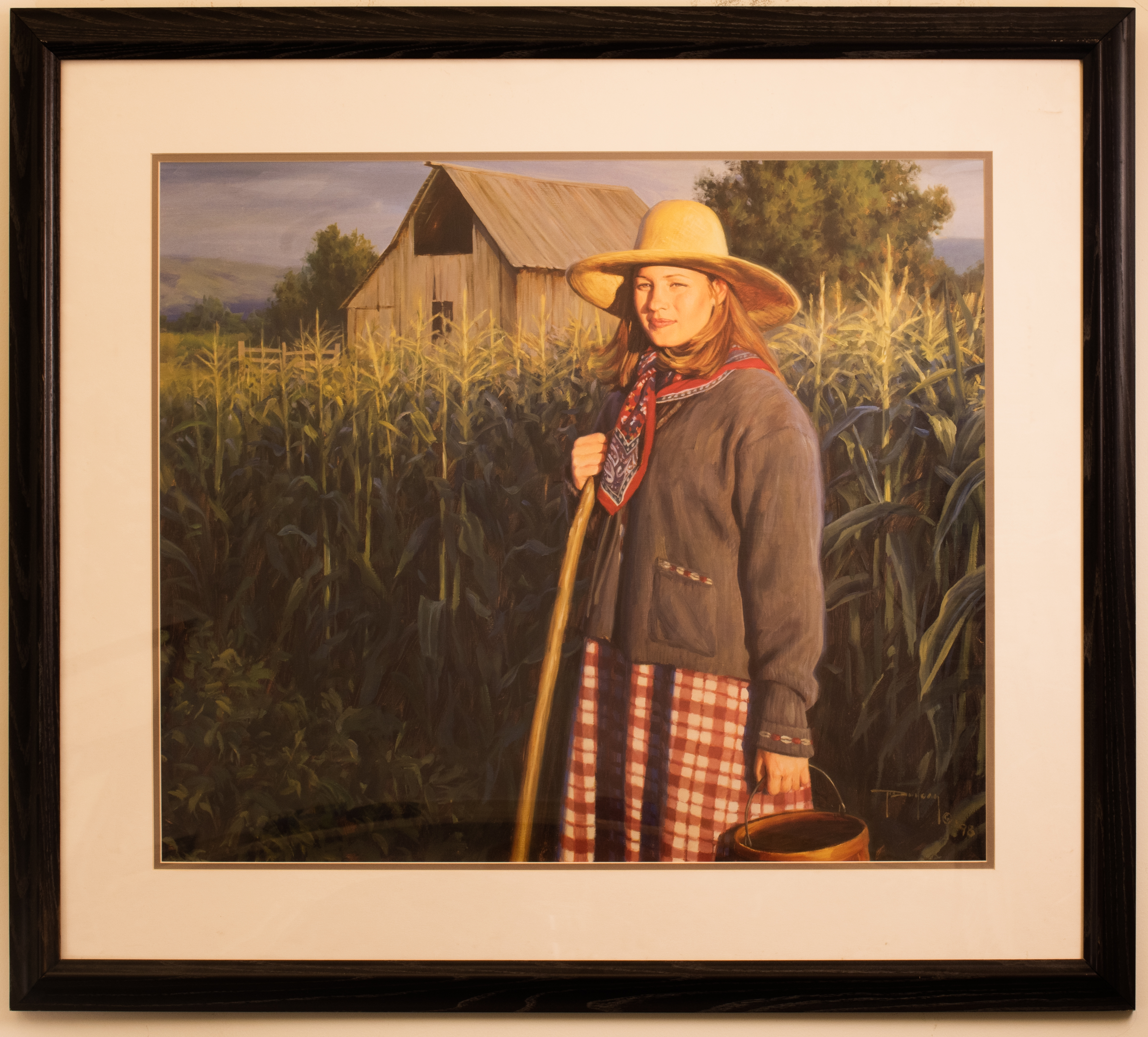In this print, a young woman stands before a plot of green corn in a sun hat, scarf, sweater, and red and white checkered dress. She holds the handle of a gardening tool in one hand and a bucket in the other. She looks directly at the viewer and also into the sun causing her eyes to squint. Robert Duncan is an established artist who began his career making Western American art and later shifted his artistic focus to his family and rural life in his home state of Utah, where this painting was likely inspired. An ode to agriculture is fitting in Kansas City in the heart of the Midwest agriculture belt.