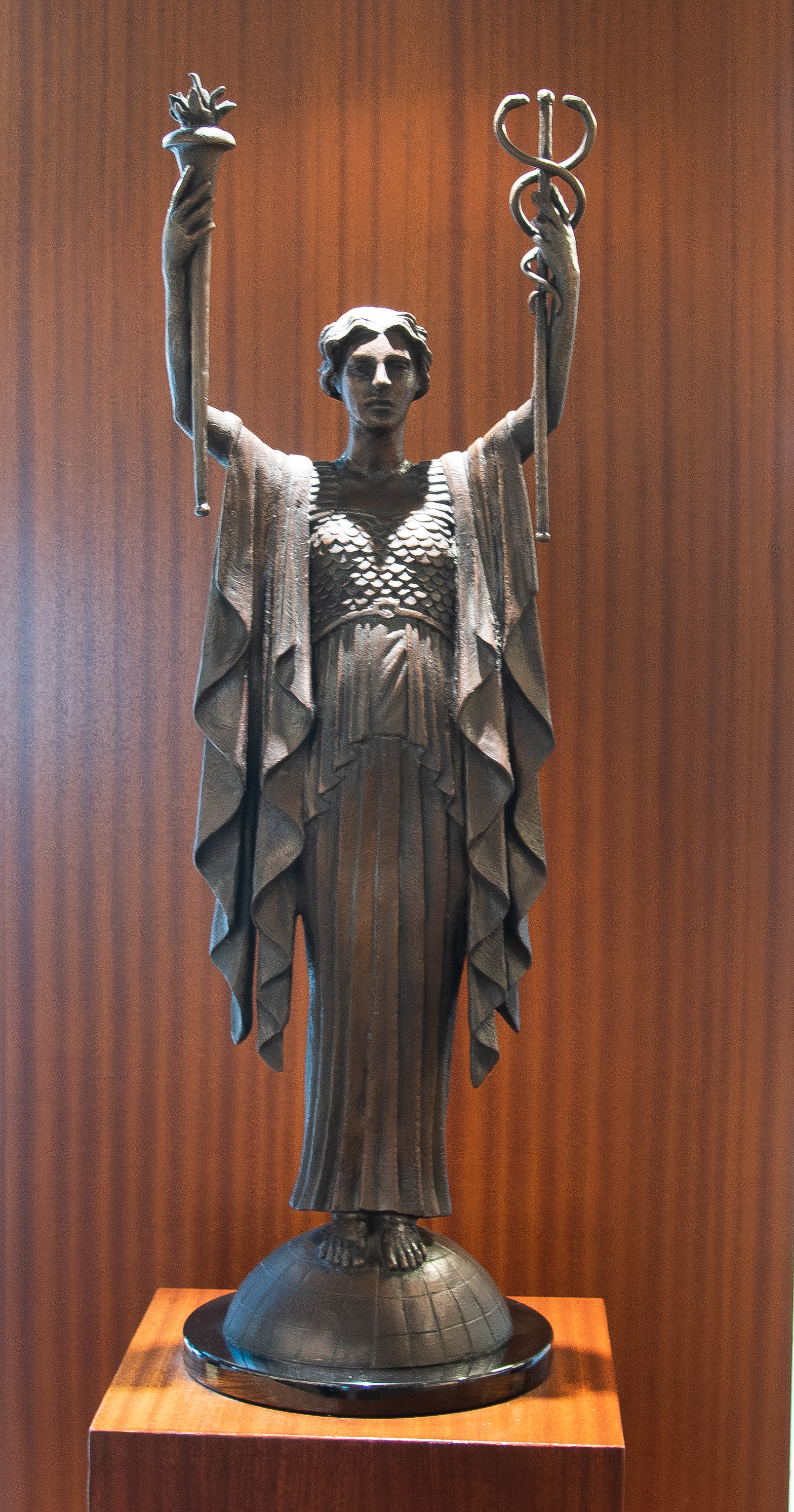 A miniature bronze maquette representing the Spirit of Commerce. The female figure is clothed in a long dress with a pleated skirt and scale-like top complete with a bow tied at the waist. A flowing shawl is draped over the figure's shoulders and arms. Her face is nobly directed upward and outward toward the viewer. Her hair is pulled up and tied back creating a Grecian wreath-like style. In her right hand, she holds a flaming torch symbolizing progress. In her left hand, she holds the caduceous of Mercury. The Roman God, Mercury, symbolizes commerce. The figure, in her full stature, stands barefoot atop one half of the world.