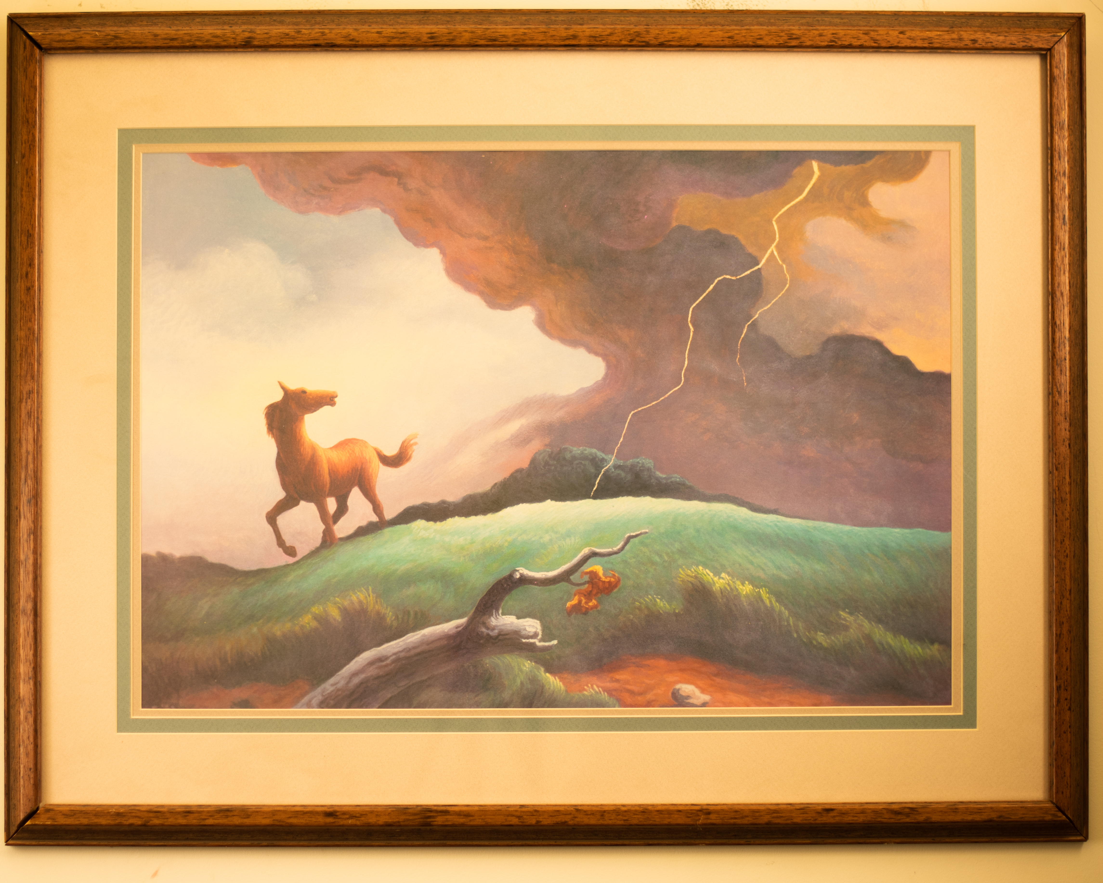 Thomas Hart Benton was at the forefront of Regionalist art movement. Benton's paintings portrayed a fluid motion to both landscape and sculpted figures, capturing every day scenes in his North American visual narratives. Benton was born on 1889 in Neosho, Missouri, and spent much of his adolescence in this state. These Midwestern roots can be seen strongly within the context of his work. Benton studied both within the United States, attending the The School of The Art Institute of Chicago, and later he traveled abroad to France, studying at the Académie Julian in Paris. Benton lived in multiple areas of the United States during his life, but settled in Kansas City, Missouri where he briefly taught at the Kansas City Art Institute. Benton died in 1975 at work in his studio, as he completed his final mural, The Sources of Country Music, for the Country Music Hall of Fame in Nashville, Tennessee. "Spring Storm" is a turbulent scene across an open plain landscape. The horizon is menacing with purple hazed clouds forming a funnel, typifying tornadic weather. A streak of lightening flashes through the right area of the sky, landing almost center of the work. Fluid grassy plains appears relatively calm compared to the threatening sky above. A winding path adds to the serenity of the lower landscape, as a loan branch arcs over the scene. As the landscape is in contrast to the scene above, a horse appears quite aware of the looming danger as it is captured running, and looking at the chaos overhead.