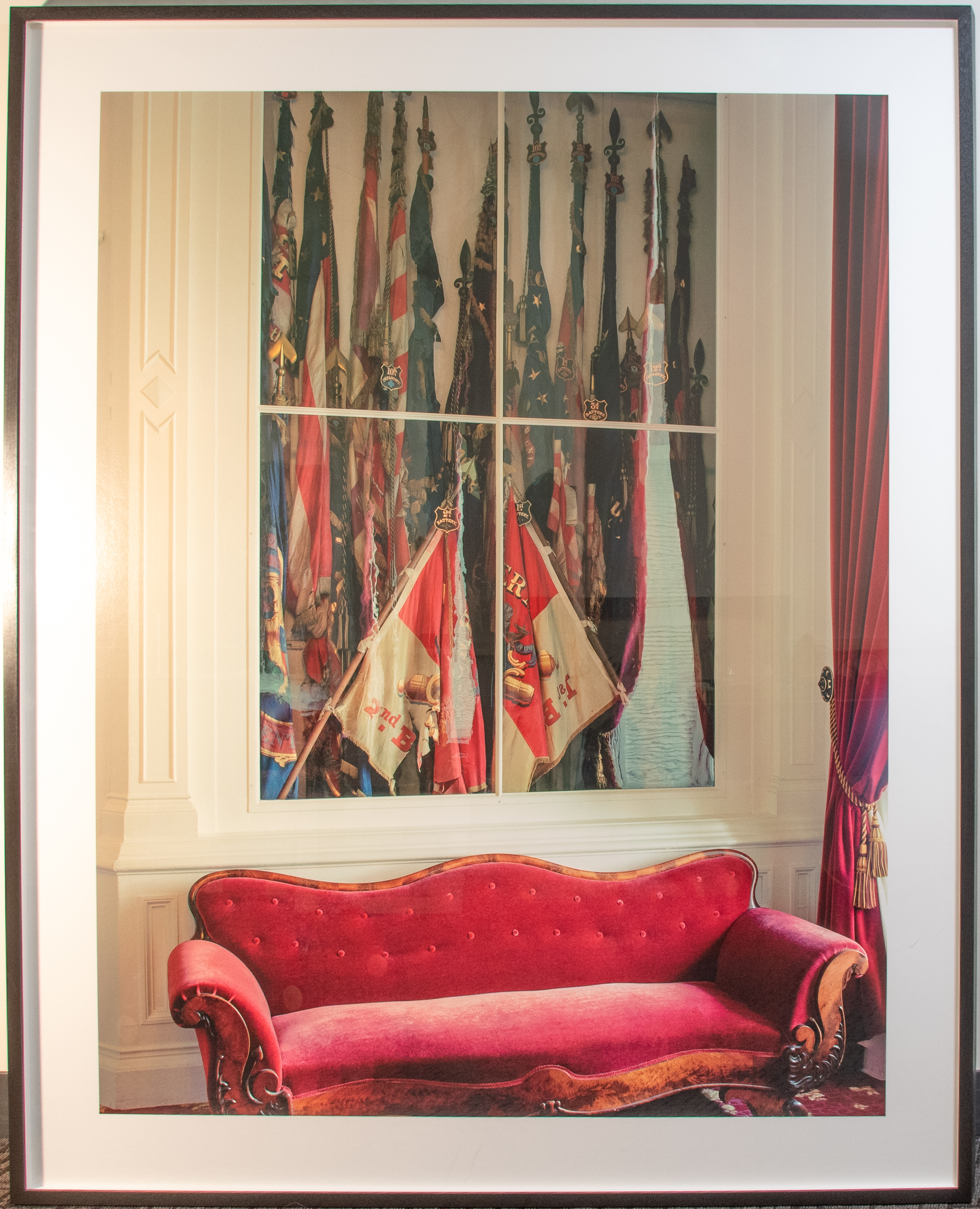 An air of honor and foundation resonates from this corner of the Vermont State Capitol Building. Red fabrics define the composition of this photograph. As the heavy velvet of the couch below the cabinet anchors the lighter fabrics of the flags inside, a visual metaphor is created for what the flags once represented and the ideologies that grounded them. Davis is most well known for his curatorial accomplishments in photography, but his personal content is notable for its striking compositions and architectural orientation. As seen here, Davis captures the character of the building in juxtaposing weights of fabric and fixture within/across the architecture of the wall itself.