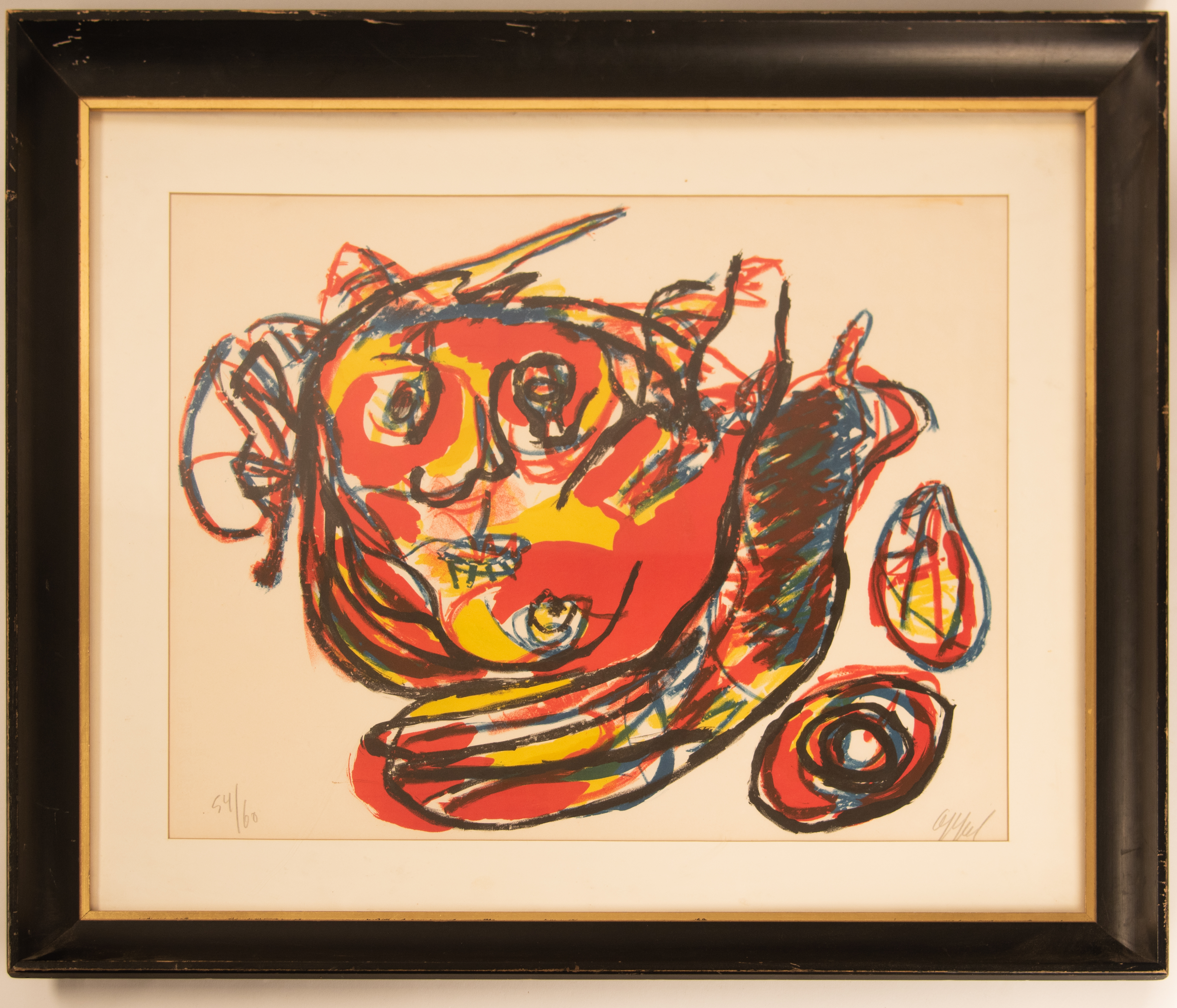 Christiaan Karel Appel, born April 25th, 1921, was a multi disciplined Dutch artist. Appel was a talented painter, sculptor, and poet. Appel began painting at the age of fourteen and attended the Rijksakademie in Amsterdam in the 1940s. Appel was one of the founders of the 1948 avant-garde movement CoBrA. Appel's talent as a sculptor achieved international fame, having works featured in MoMA and other museums worldwide. Appel derived much inspiration from primitive art and children’s drawings. Appel is primarily known for his paintings that combine elements of both figuration and of abstraction. His paintings were known for the bright color, violent brushwork and thick application of impasto pain. Appel died on May 3rd, 2006, in his home in Zürich, Switzerland. This abstract still life, Tete Volante, contains all the characteristics that Appel is known for, in this composition vibrant hues of red, yellow, blue and green are predominant and emphasized by thick contour strokes. A couple of the immediate identifiable fruits are a banana and a pear. The rest of the work can be interpreted differently by each viewer, the platter for instance has elements of a visage. The print is signed by the artist and is numbered 54/60.
