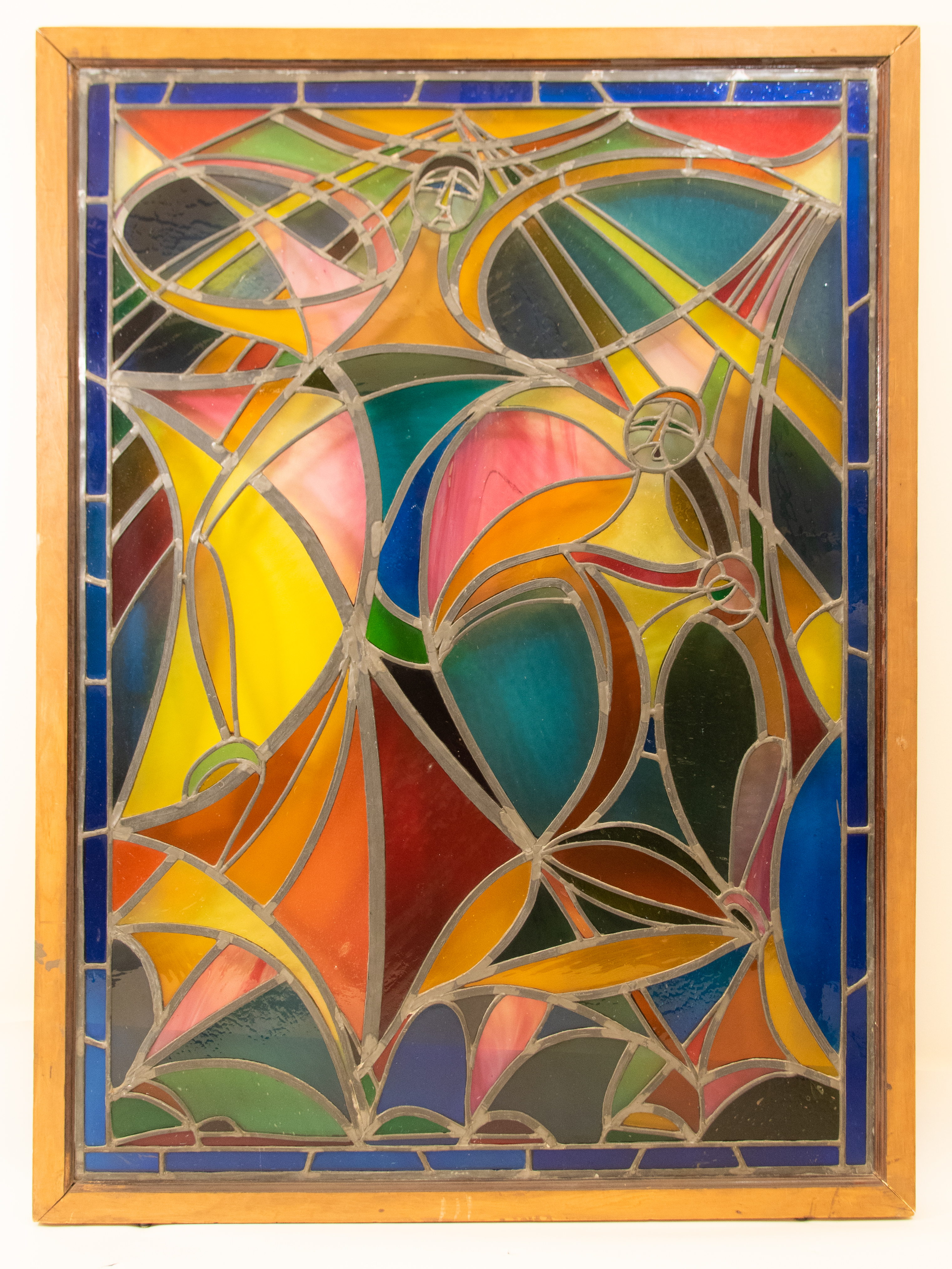 The stained glass window depicts Gabriella Polony Mountain's variation on a theme of the Old Testament's Tobias and the Angel from the Book of Tobit (393 AD). The Archangel Raphael is depicted in grand form with wings spread, he towers above the human form of Tobias. Polony-Mountain uses the lead lines to create differentiation of form and shape with the selection of color seeming almost secondary to her use of line.