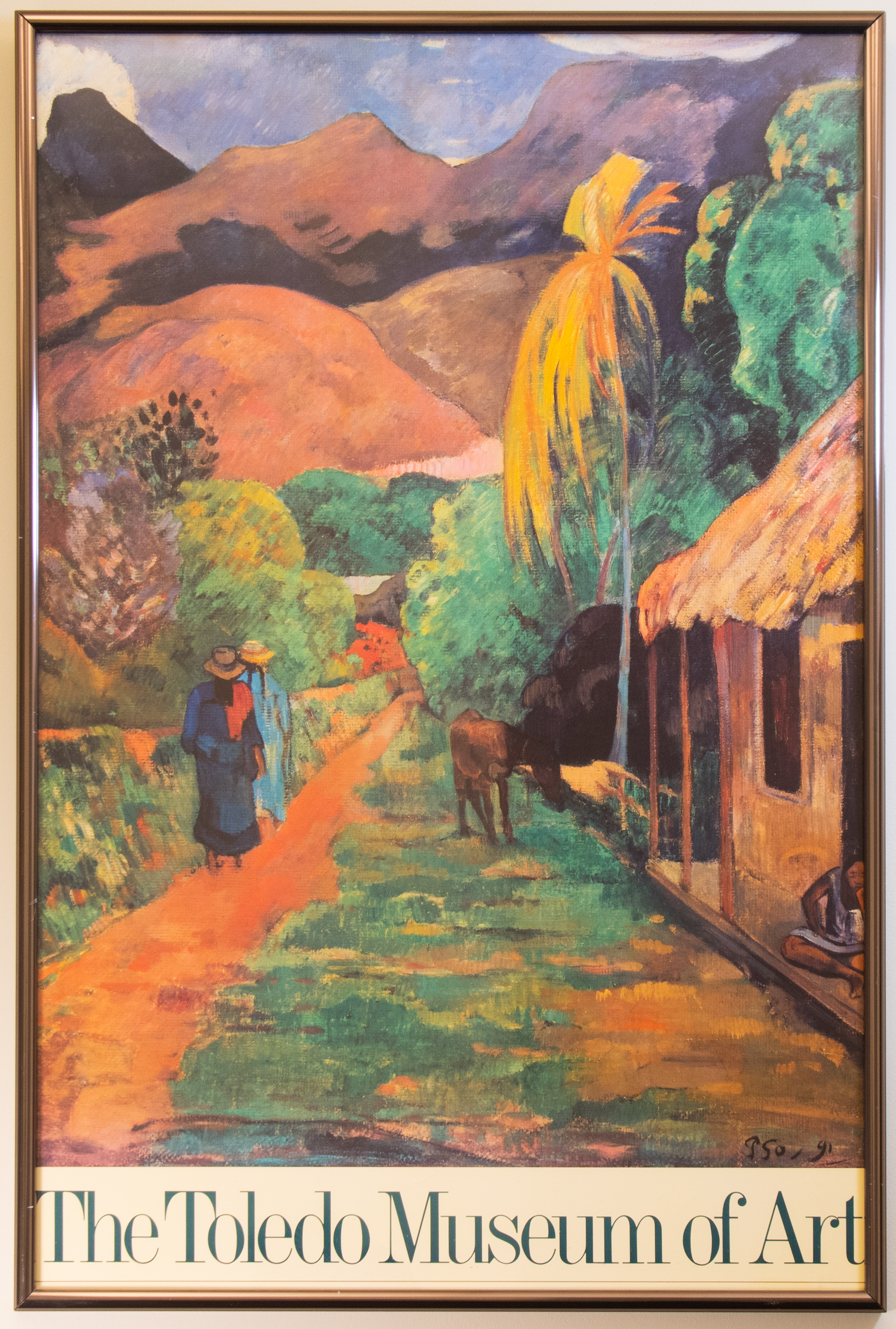 This poster for the Toledo Museum of Art uses one of the museum collection's prized pieces, "Street in Tahiti" (1891) by French Post-Impressionist painter Paul Gauguin. The poster was likely created in correspondence to the exhibition "Impressionism: Selections from Five American Museums" contributed to by the Carnegie Museum of Art in Pittsburgh, the Minneapolis Institute of Arts, the Nelson-Atkins Museum of Art in Kansas City, the Saint Louis Art Museum, and Toledo Museum of Art. The exhibition traveled to each of the participating museums from 1989-1990. The Toledo Museum of Art likely contributed this piece, among others, for its significance in Gauguin's career. "Street in Tahiti" was among the first group of paintings the artist created when he traveled to the island in an effort to escape European culture. He became enamored with the island and conveyed its liveliness and naturality through vibrant colors and heavy vegetation.