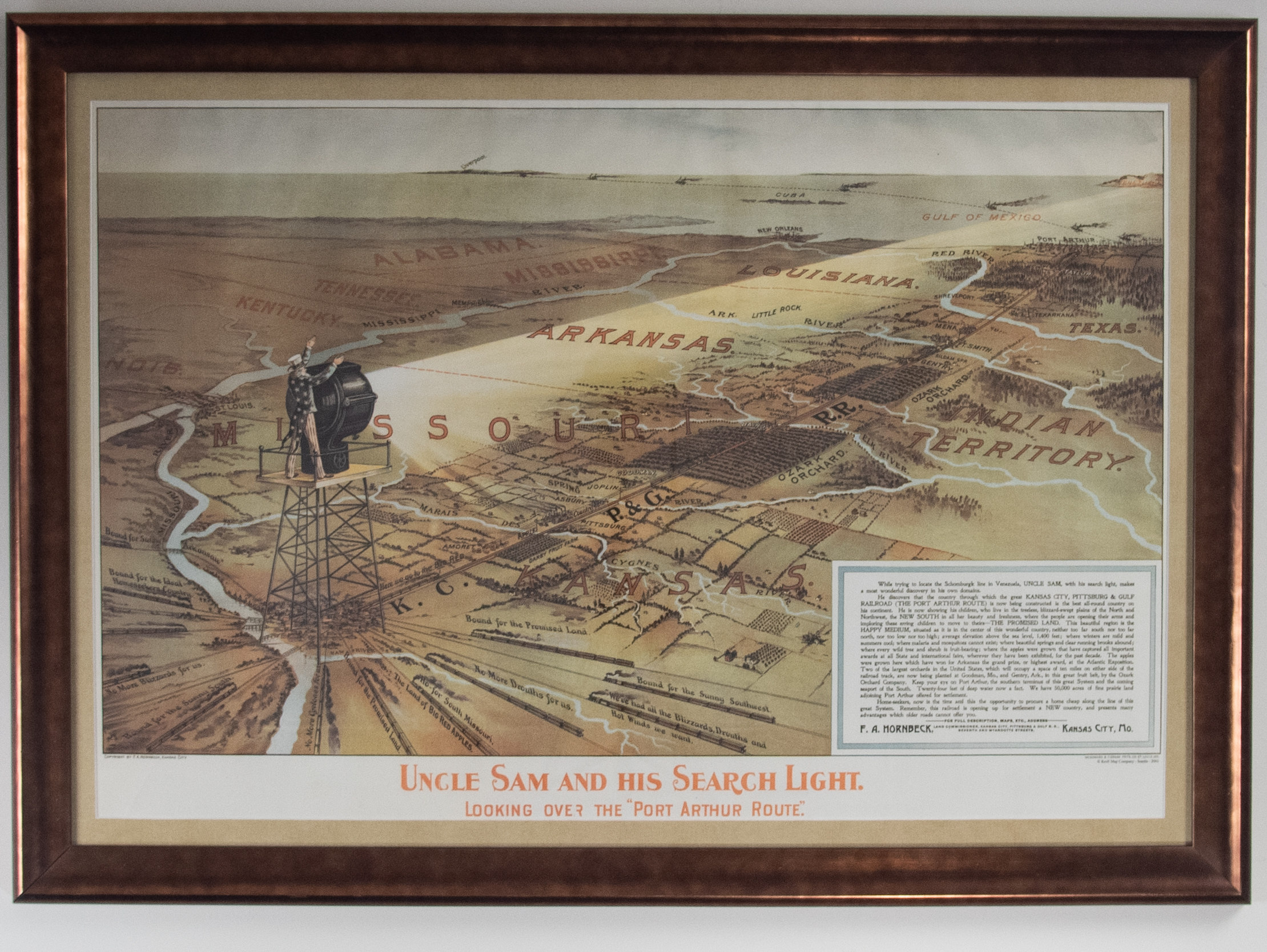 In this map, Uncle Sam stands atop a platform shining his searchlight onto the Kansas City, Pittsburg, and Gulf Railroad referred to in shorthand here as "The Port Arthur Route." A didactic in the lower right hand corner explains that while Uncle Sam was looking for the Schomburgk Line like in Venezuela, he discovered the (literal) fruits of his own domain, namely the "The Promised Land" region of North America between the blizzards of the north and the swampy heat of the south. This land is reportedly mild, pleasant, and fertile with world-class apple orchards shown lining the railway route. Accordingly, the didactic calls on the American people to populate this land and to remember that it will be the Port Arthur Route that will make it possible. The map acts as a kind of advertisement for the route, the land it covers, and the overall expansion of the New World.
