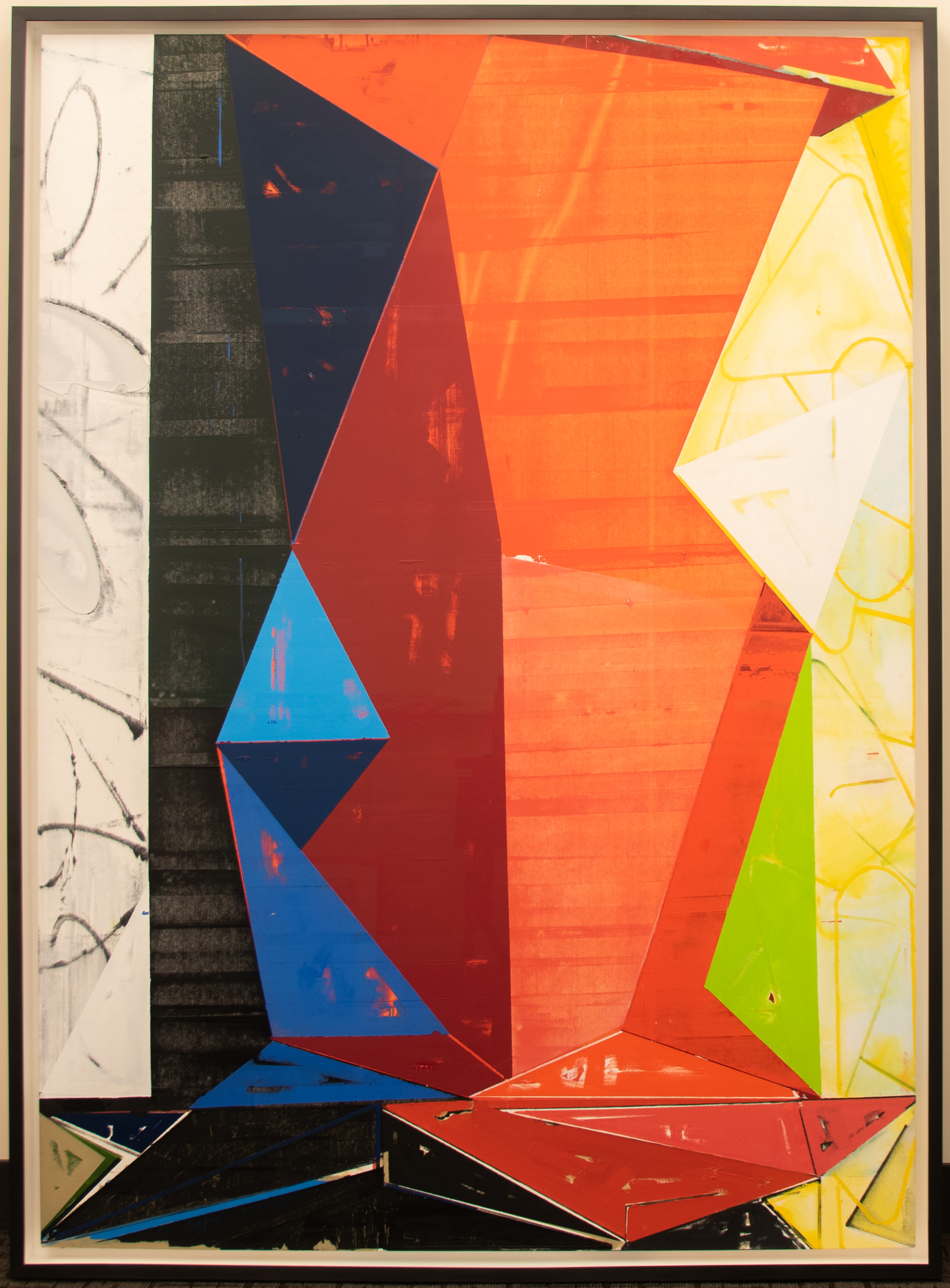 This painting commands the viewer's attention with color blocks modulated by geometric shapes. While the color blocks appear to be longitudinally oriented, overlapping paint layers in some supply a lateral element. The shapes comprising each block allow for a study of color within them expressed through contrasting and overlapping layers. Although the shapes can hold the viewer's eye throughout the painting, the concentration of triangular shapes near the bottom of the work creates a downward trend of movement overall. With his earlier sculptural work, Rosser was interested in revealing new things about each piece by creating the ability for them to be displayed on the wall or floor. His 2019-2021 oil painting explores dimensionality through color instead, which evokes different geometric forms as the viewer moves around the work.