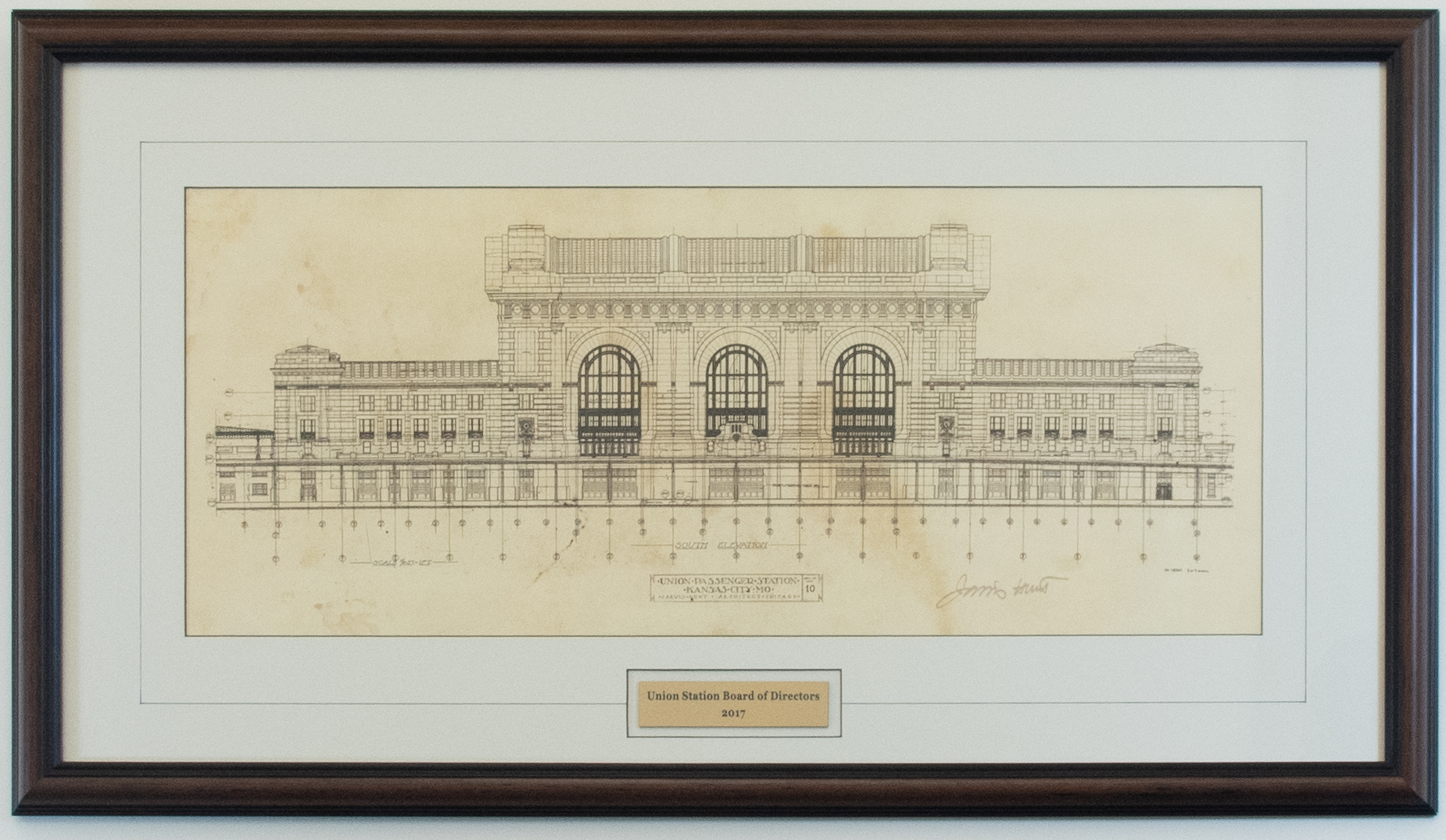 Kansas City's Union Station was built in 1914 as a product of the City Beautiful movement, an urban planning initiative in the United States in the late 19th and early 20th centuries to introduce grandeur to cityscapes. The new structure would replace the original Union Depot in the West Bottoms and be moved out of the floodplain and closer to the city's metropolitan center near Main Street and Pershing Road along the Kansas City Terminal Railway. Chicago Architect Jarvis Hunt was selected by the movement and designed the building accordingly in a Beaux-Arts style, including elements such as classical masonry, arched windows, a hierarchy of spaces, and a flat roof. The exterior, rendered in this drawing, corresponds to the grand central hall flanked on both sides by lowered structures for administrative spaces. Three massive arched windows punctuated by a monumental stone colonnade define the hall's exterior design. The architect named the structure "Union Passenger Station Kansas City MO" in a tag below the building itself that also includes his name, profession, location, and date created which was December 1st, 1910.