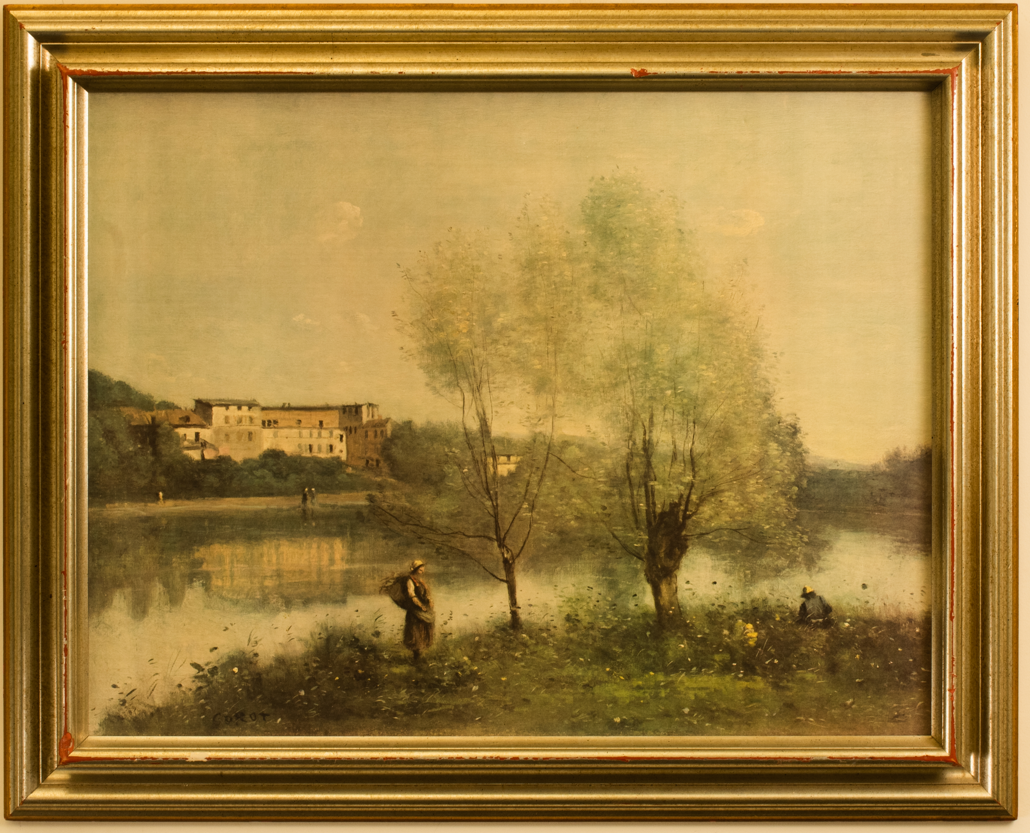 Jean-Baptiste-Camille Corot inherited property from his parents at Ville-d'Avray and created many paintings with a large pond on the property as the subject (-metmuseum.org). In this particular work, two village people stand in the foreground amongst a haze of tall grasses. The grasses fade into the calm waters of the pond that reflect the buildings along the horizon line. The overall tone is cool and muted, but the brightness of white in the painting and highlighted leaves in the trees suggest the sun might've been shining through a thin layer of clouds. Corot was one of the early painters to explore the Impressionist style and his prioritization of the expression of mood over topographical details greatly influenced the movement (-artsy.net). Here this quality shows as details are suggested but unfinished while a calmness, one typical of a small village like the one depicted, is palpable in the painting.