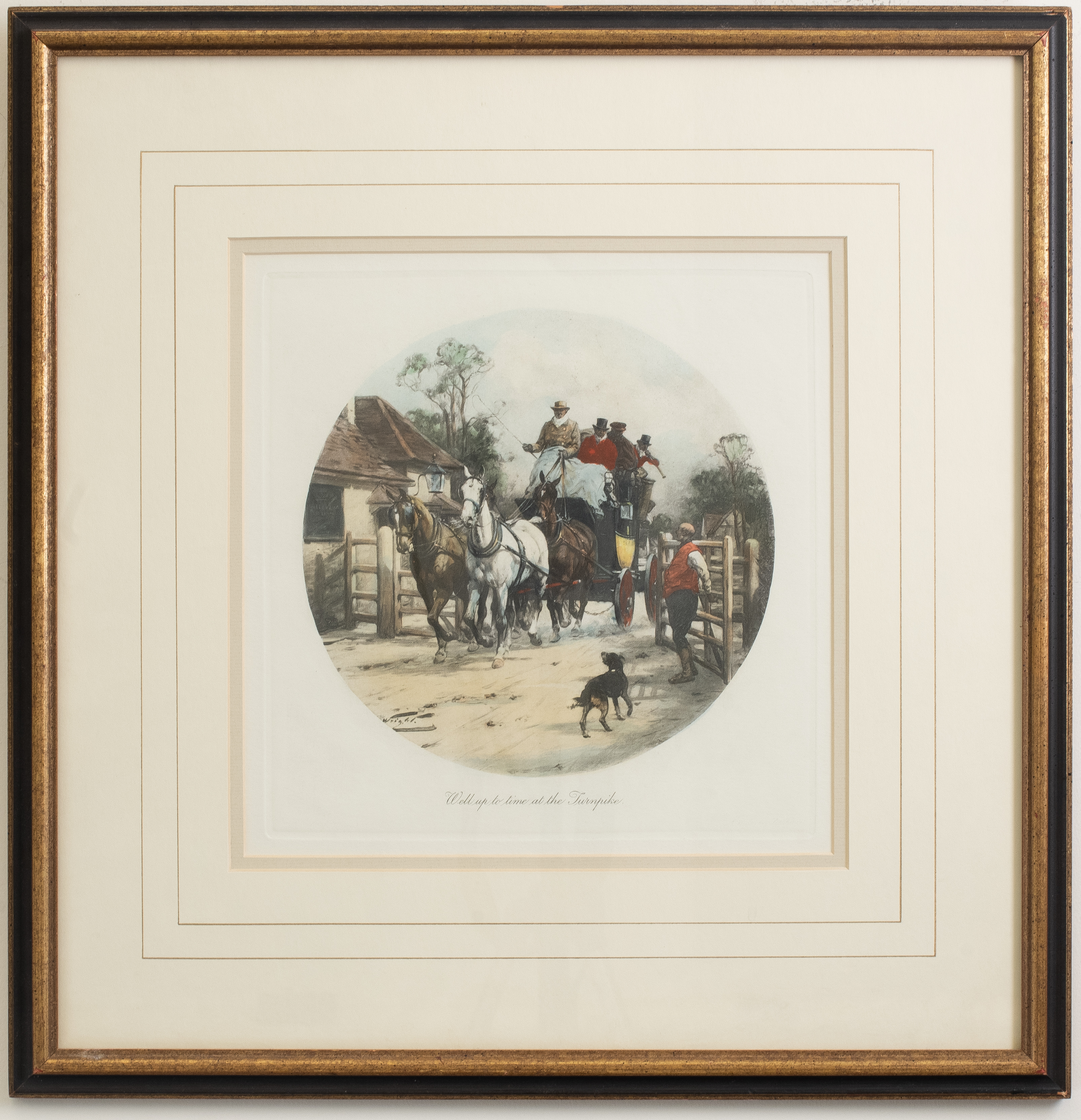 George Wright was a British painter of coaching and hunting scenes. He was the elder brother of Gilbert Scott Wright. Mainly a self taught artist, although it is thought he worked with his younger brother until 1925. During that time their combined work was frequently reproduced on calendars. Wright lived for some time in Rugby and Oxford before moving to Richmond in Surrey in 1929 and later he chose to retire to Seaford in Sussex, where he remained until his death in 1942. Considered to be one of the best sporting painters of his time and his highly accomplished action paintings were exhibited at the Royal Academy from 1892 and at many other venues in the country (-information gathered from http://www.artnet.com/artists/george-wright-2/biography). This etching captures a rural scene from the 19th century, depicting a horse drawn coach, with four coachman sitting atop the carriage. Situated at the front of the carriage, consists of two coachmen, the driver and his companion. Behind these figures are two additional carriage riders, one of the figures is blowing a horn announcing their arrival. Each of the coachmen are heavily attired, indicating this scene may have taken place during winter. The two front figures are covered with a blanket, which emphasizes the cooler weather conditions. The coach is entering through an open gate, held by a balding attendee. A dog seems to be keeping the gate-man company, as he inspects the arrivals. It appears the coach is departing from a picturesque village, based on the country style housing that appear to the left and right of the background. A tree line is also depicted among the village houses. The print is circular with the title of the work "Well up to time at the Turnpike" printed, in cursive, below the scene.