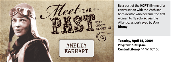 Kansas City Public Library Director Crosby Kemper III interviews Amelia Earhart, portrayed by Ann Birney, as part of the Library's Meet the Past series on Tuesday, April 14, at 6:30 p.m. at the Central Library, 14 W. 10th St.