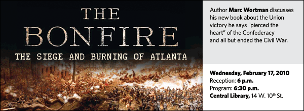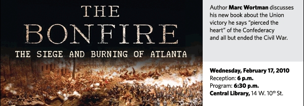 Author Marc Wortman discusses his new book The Bonfire: The Siege and Burning of Atlanta on Wednesday, February 17, at 6:30 p.m. at the Central Library, 14 W. 10th St.