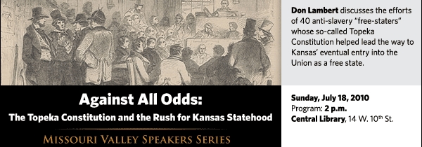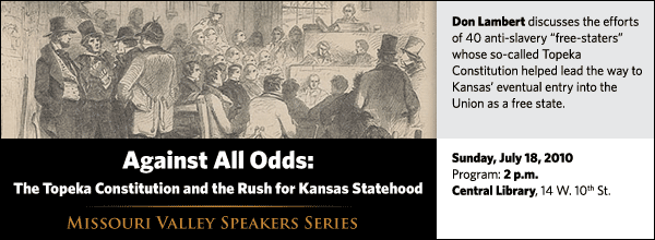 Don Lambert discusses the efforts of 40 men and women whose so-called Topeka Constitution marked a milestone on the road Kansas would take to eventually enter the Union as a free state on Sunday, July 18, at 2 p.m. at the Central Library, 14 W. 10th St.