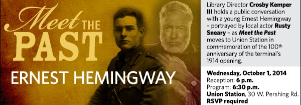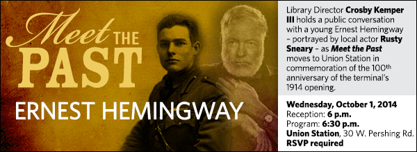 Union Station, 30 W. Pershing Rd. Once the episode is aired on KCPT, it will be made available at kclibrary.org/meet-the-past. You MUST RSVP in order to be admitted to this event. Your RSVP entitles you to the specified number of general admission tickets. Tickets may be picked up at the Union Station ticket office starting at 5 p.m. on the day of the event. Standard Union Station parking rates apply. Rusty Sneary is co-founder/co-owner/artistic director of The Living Room Theatre. He has appeared in productions with almost every theatre company in Kansas City: Kansas City Repertory Theatre, Unicorn Theatre, Kansas City Actors Theatre, etc. Among his theatre credits are A Christmas Carol, Master of the Universe, Venus in Fur, Carousel, Death of a Salesman, August: Osage County, Omnium Gatherum, and The Real Inspector Hound. Crosby Kemper III, director of the Kansas City Public Library, has conducted numerous televised conversations with notable figures from Kansas City’s past portrayed by local actors and performers, ranging from Tom Pendergast and Ameila Earhart to Charlie Parker and Jesse James. The program will be taped by KCPT for later broadcast. It also will be shown at Union Station during the Centennial Open House weekend, November 1-2, 2014. Co-presented by The Kansas City Public Library and Union Station. Co-sponsored by the National World War I Museum at Liberty Memorial.