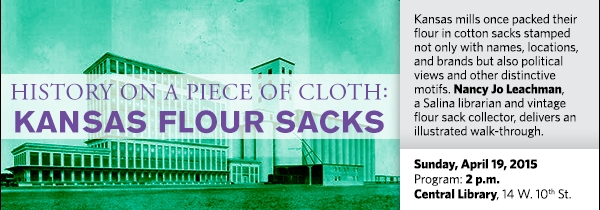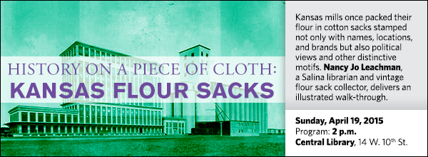 Avid collector Nancy Jo Leachman, a longtime reference librarian at the Salina Public Library, has accumulated more than 100 vintage flour sacks from the 1920s-1940s, representing more than 30 Kansas counties. Her illustrated lecture of the best and most colorful—nothing “run-of-the-mill” here—reveals how each sack carries a fascinating story, be it advancing nutritional information, expressing political views, or reflecting popular culture.
