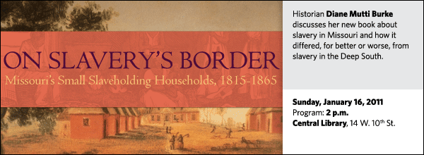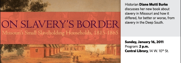Diane Mutti Burke, an assistant professor of history at the University of Missouri – Kansas City, discusses her new book about slavery in Missouri and how it differed from the Deep South on Sunday, January 16, 2011, at 2 p.m. at the Central Library, 14 W. 10th St.
