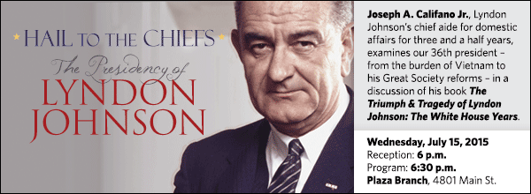He also was the architect of a lasting economic and social revolution, pushing through Medicare, the Voting Rights Act, and other reforms as part of an ambitious Great Society agenda that reached high tide 50 years ago. Joseph A. Califano Jr., Johnson’s chief aide for domestic affairs from 1965-69 and later Secretary of Health Education and Welfare in the Carter administration, delivers an inside look at our 36th president in a discussion of his book The Triumph & Tragedy of Lyndon Johnson: The White House Years. The New York Times Book Review says “Johnson leaps out of the pages in all his raw and earthy glory,” while The Washington Post calls it “a joy to read [and] of what anecdotes.”