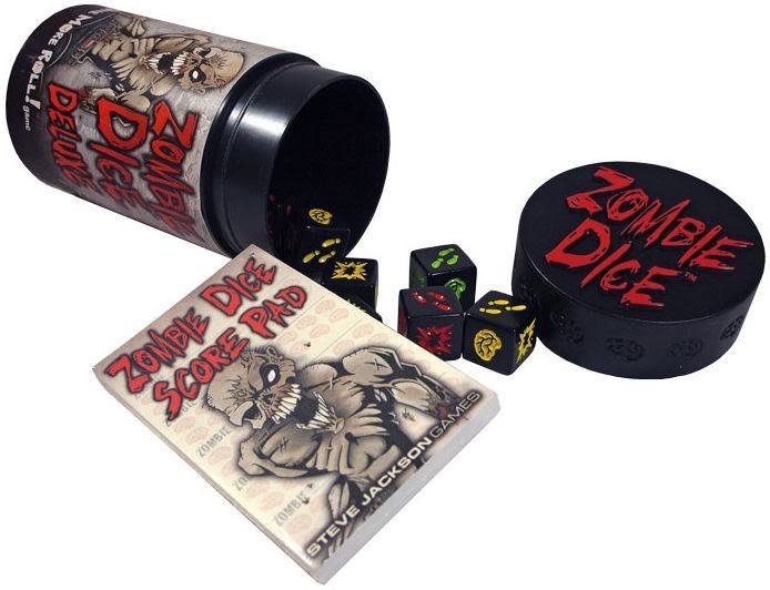 Players are zombies with a hankering for braaaains! Six-sided dice are rolled to collect brains to munch on while avoiding shotgun blasts that end your turn. The first player to devour 13 brains wins.