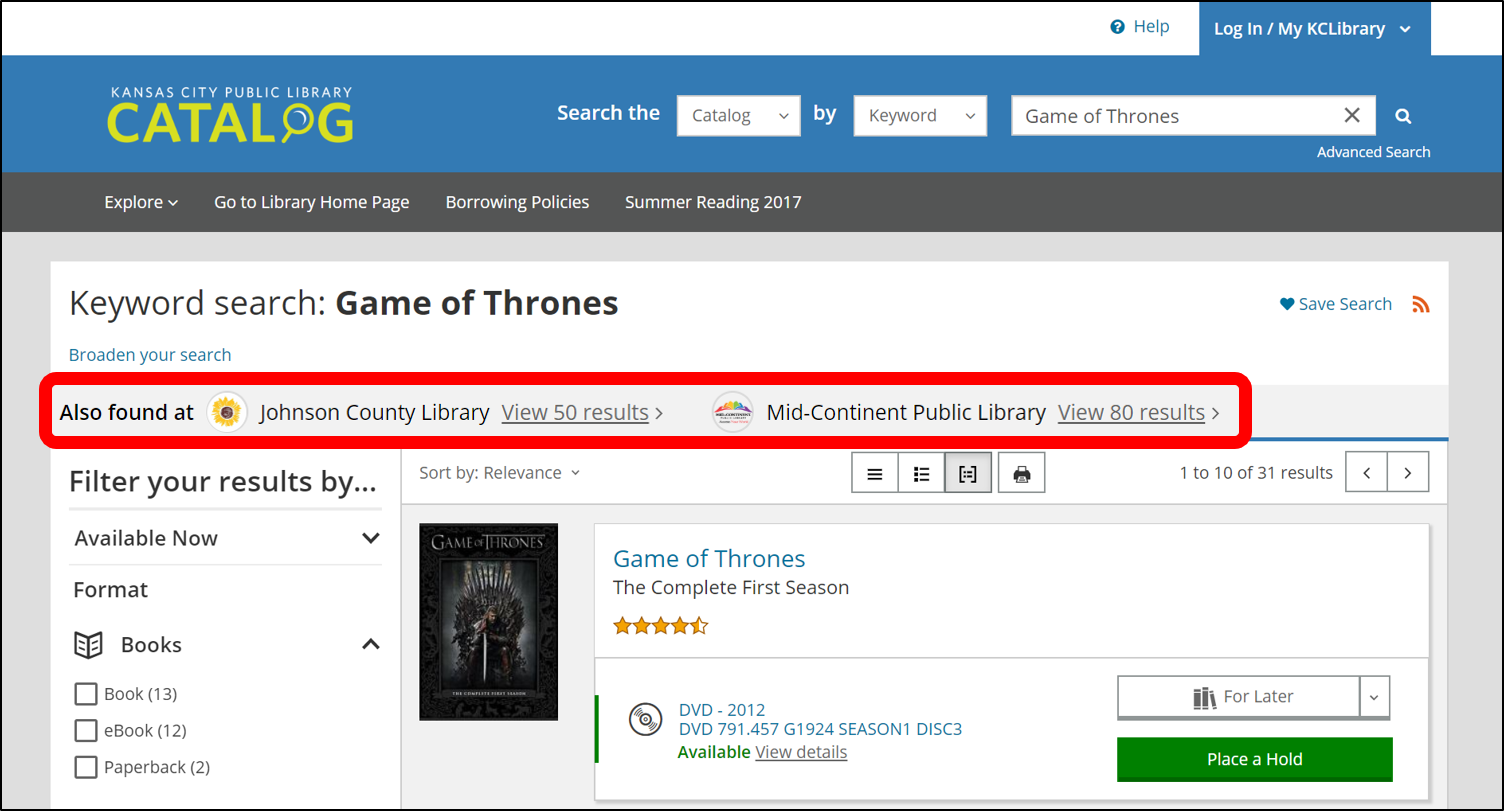 Now, we’ve further integrated the search process. If you search the catalog of one library system, you’ll automatically search the collections of the other three systems. Say you log in through the Kansas City Public Library and are looking for something in the Game of Thrones series. You’ll get a listing of our materials, plus a numerical prompt for what’s available at Mid-Continent, Johnson County/Olathe.