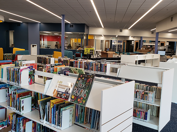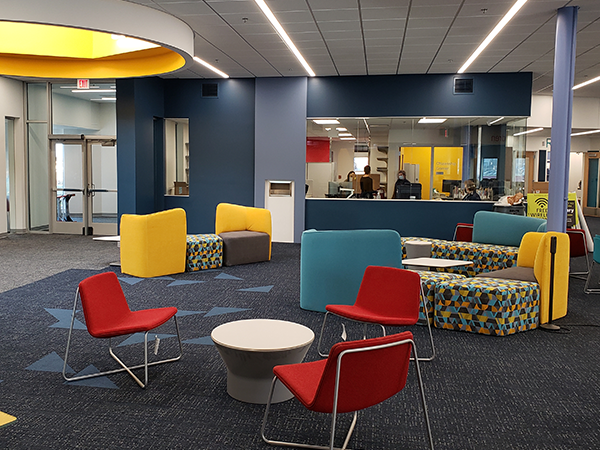 We have some amazing new spaces for the community to use. The Studio is a multipurpose room for youth activities and artistic revelry. New and reimagined study and meeting rooms will host community activities and other in-person gatherings (remember those?). Common areas with new brightly colored, comfortable furniture serve as “Social Spaces” where people can meet for small study sessions, sit and page through the latest magazines, or just casually hang out with friends.