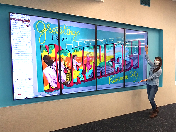 A digital wall exhibit showcases the neighborhood's creative murals.