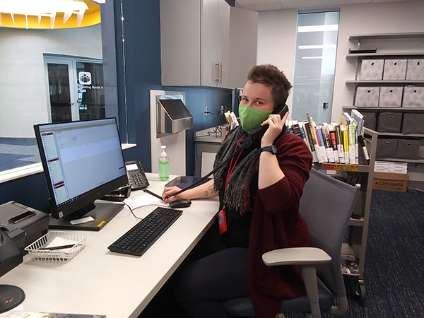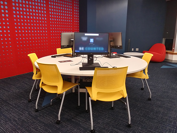 We've also made space where a pair of people can book some collaboration time. Reserve a Study Spot in our new Corner Lobby area, where you can comfortably bring your own laptop or device to make use of our free Wi-Fi and printing services, do some deep-dive reading or focus time, or meet with a colleague or classmate on a shared project. Study Spots are limited to one-hour sessions for only one or two socially distanced people.