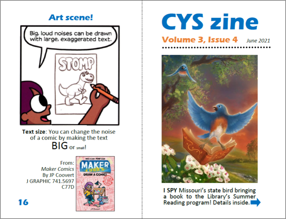 The June 2021 CYS kids zine is now available! It is full of fun Summer Reading books & activities, including a Missouri puzzler, Gateway Arch how-to, pizza art, and some hot firefighter jokes!