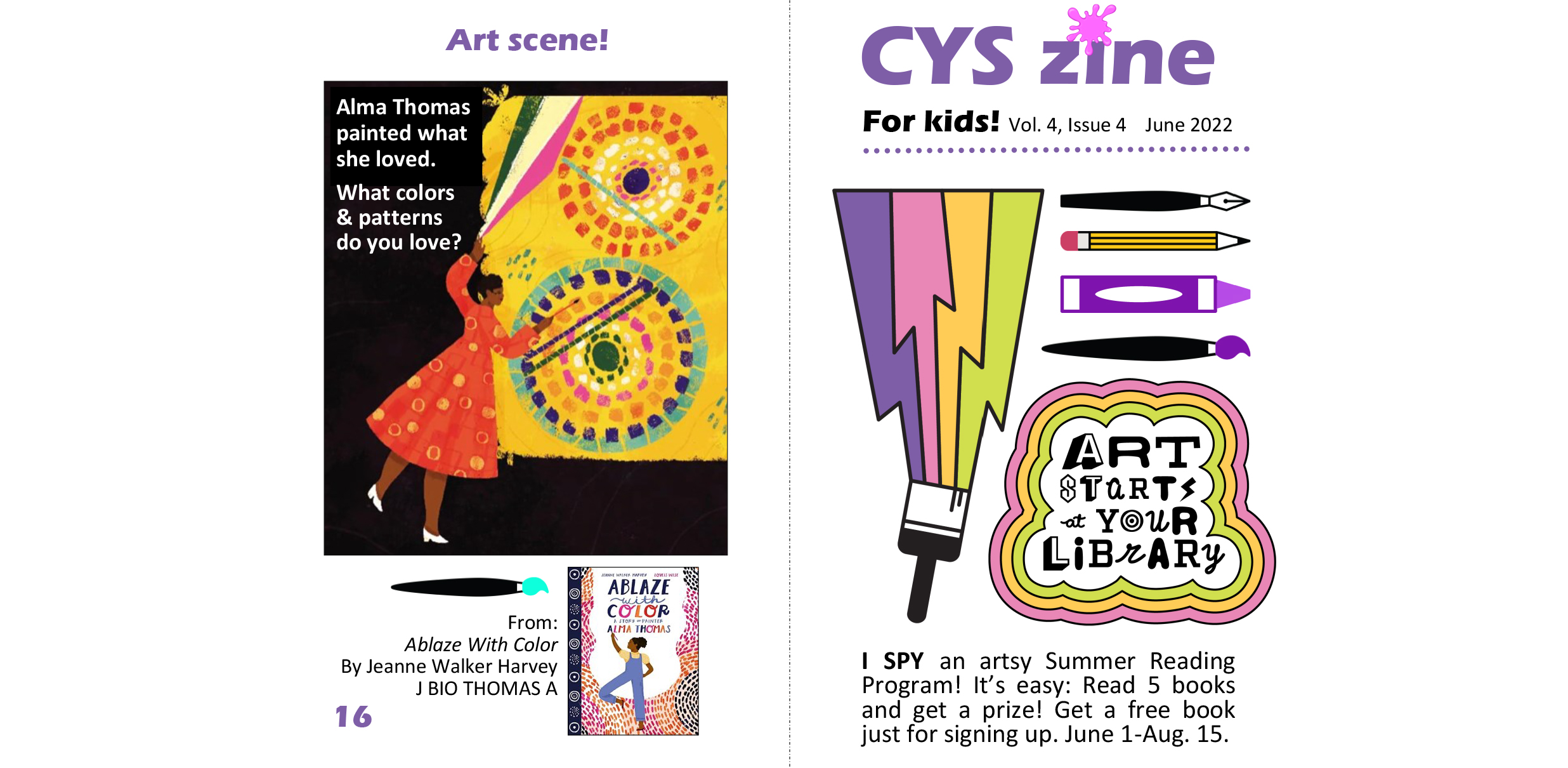 The CYS Zine is a 16-page monthly mini magazine that highlights what's new and notable in the children's department of the Central Library. Each issue is filled with new books and upcoming events, plus amazing facts, funny jokes, poetry, artwork, and puzzles. You can pick up a copy at the Central Library CYS service desk, or download a copy online, print it, and enjoy the zine from home.