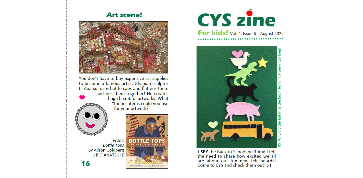 The CYS Zine is a 16-page monthly mini magazine that highlights what's new and notable in the children's department of the Central Library. Each issue is filled with new books and upcoming events, plus amazing facts, funny jokes, poetry, artwork, and puzzles. You can pick up a copy at the Central Library CYS service desk, or download a copy online, print it, and enjoy the zine from home.