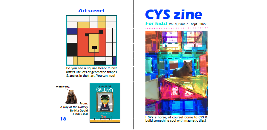 The CYS Zine is a 16-page monthly mini magazine that highlights what's new and notable in the children's department of the Central Library. Each issue is filled with new books and upcoming events, plus amazing facts, funny jokes, poetry, artwork, and puzzles. You can pick up a copy at the Central Library CYS service desk, or download a copy online, print it, and enjoy the zine from home.