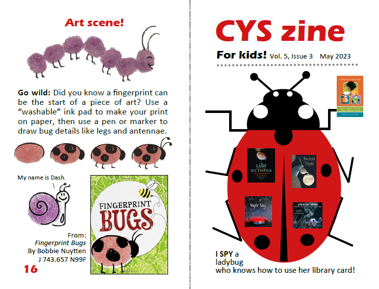 Insect jokes bug me, so let me just say: The May Central Youth Services zine is now available for pick up at CYS or you can print one out!
