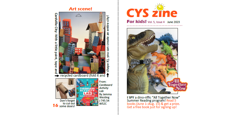 The CYS Zine is a 16-page monthly mini magazine that highlights what's new and notable in the children's department of the Central Library. Each issue is filled with new books and upcoming events, plus amazing facts, funny jokes, poetry, artwork, and puzzles. You can pick up a copy at the Central Library CYS service desk, or download a copy online, print it, and enjoy the zine from home.
